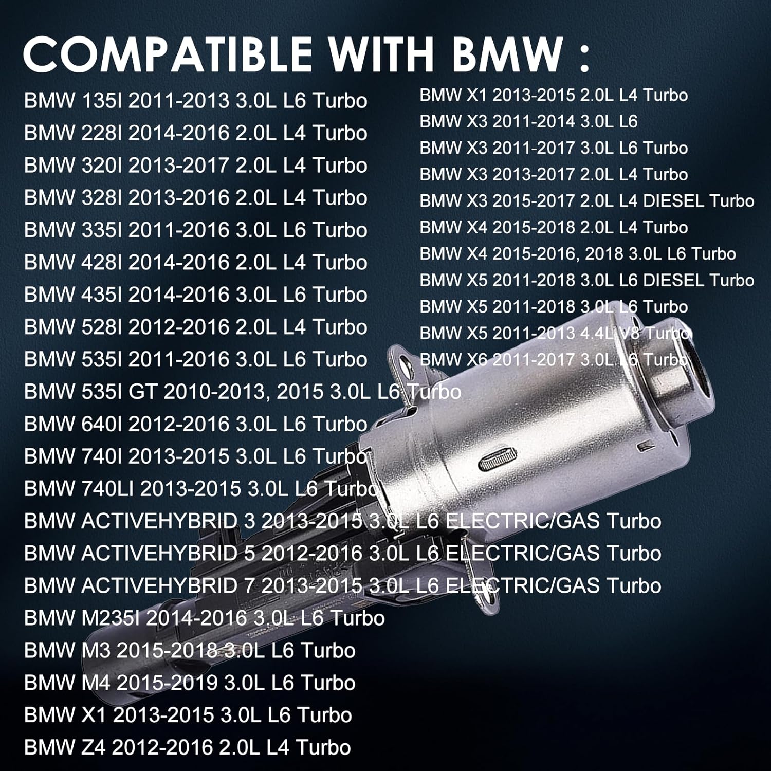 Package Included: 1* Eccentric Shaft ActuatorCompatible with BMW 2010 - 2019 For BMW 135I 2011-2013 3.0L L6 TurboFor BMW 228I 2014-2016 2.0L L4 TurboFor BMW 320I 2013-2017 2.0L L4 TurboFor BMW 328I 2013-2016 2.0L L4 TurboFor BMW 335I 2011-2016 3.0L L6 TurboFor BMW 428I 2014-2016 2.0L L4 TurboFor BMW 435I 2014-2016 3.0L L6 TurboFor BMW 528I 2012-2016 2.0L L4 TurboFor BMW 535I 2011-2016 3.0L L6 TurboFor BMW 535I GT 2010-2013, 2015 3.0L L6 TurboFor BMW 640I 2012-2016 3.0L L6 TurboFor BMW 740I 2013-2015 3.0L L6 TurboFor BMW 740LI 2013-2015 3.0L L6 TurboFor BMW ACTIVEHYBRID 3 2013-2015 3.0L L6 ELECTRIC/GAS TurboFor BMW ACTIVEHYBRID 5 2012-2016 3.0L L6 ELECTRIC/GAS TurboFor BMW ACTIVEHYBRID 7 2013-2015 3.0L L6 ELECTRIC/GAS TurboFor BMW M235I 2014-2016 3.0L L6 TurboFor BMW M3 2015-2018 3.0L L6 TurboFor BMW M4 2015-2019 3.0L L6 TurboFor BMW X1 2013-2015 3.0L L6 TurboFor BMW X1 2013-2015 2.0L L4 TurboFor BMW X3 2011-2014 3.0L L6For BMW X3 2011-2017 3.0L L6 TurboFor BMW X3 2013-2017 2.0L L4 TurboFor BMW X3 2015-2017 2.0L L4 DIESEL TurboFor BMW X4 2015-2018 2.0L L4 TurboFor BMW X4 2015-2016, 2018 3.0L L6 TurboFor BMW X5 2011-2018 3.0L L6 DIESEL TurboFor BMW X5 2011-2018 3.0L L6 TurboFor BMW X5 2011-2013 4.4L V8 TurboFor BMW X6 2011-2017 3.0L L6 TurboFor BMW Z4 2012-2016 2.0L L4 TurboNote: The product contains internal mechanical structures, in order to ensure the normal operation of internal mechanical structures such as springs or paddles, the product is injected with grease when it leaves the factory, and the product is installed and tested twice before it is manufactured and shipped, the scratches at the interface are left by the inserted interface and pulled out interface on the machine test to ensure the normal operation of the product, and the grease inside or on the surface of the product is to ensure that the product normal operation of the product and add protective elements! Does not mean that this product is used products!