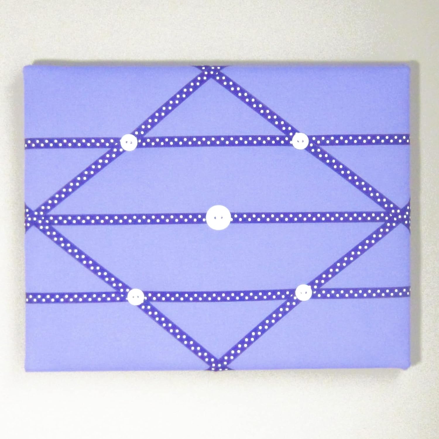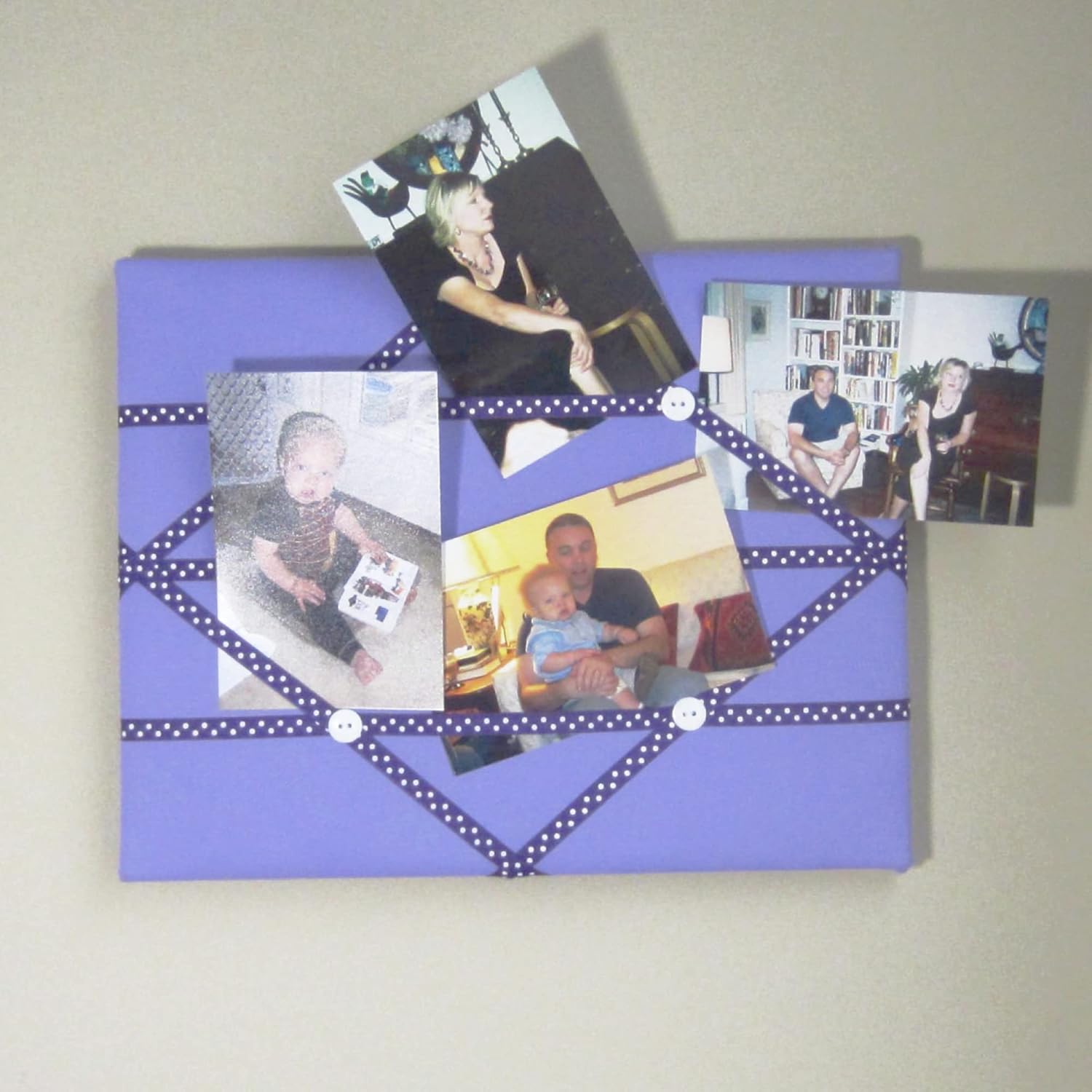 This 11"x14" memory board is covered in a lilac fabric. The ribbon is purple & white polka dot grosgrain. The white buttons are in two different sizes.This Handmade fabric memory boards are designed to be used without tacks or push pins. Great for: *Organizing photographs (your own or all those Christmas photo cards!) *Organizing business cards *Hanging hair accessories or jewelry *Safely storing your household bills *Organizing the million slips of paper covering your desk! This memory board is made with designer fabrics and top quality materials. The back is finished with a felt back and ribbon. Each memory board has a saw tooth hanger on the vertical and horizontal sides. Due to the many variations in monitors and browsers, color samples may appear different on different monitors. Computer monitors are not all calibrated equally and color reproduction on the Internet is not precise. Since it is not possible to guarantee our online colors will look the same on all computers, we do not guarantee that what you see accurately portrays the color of the actual product
