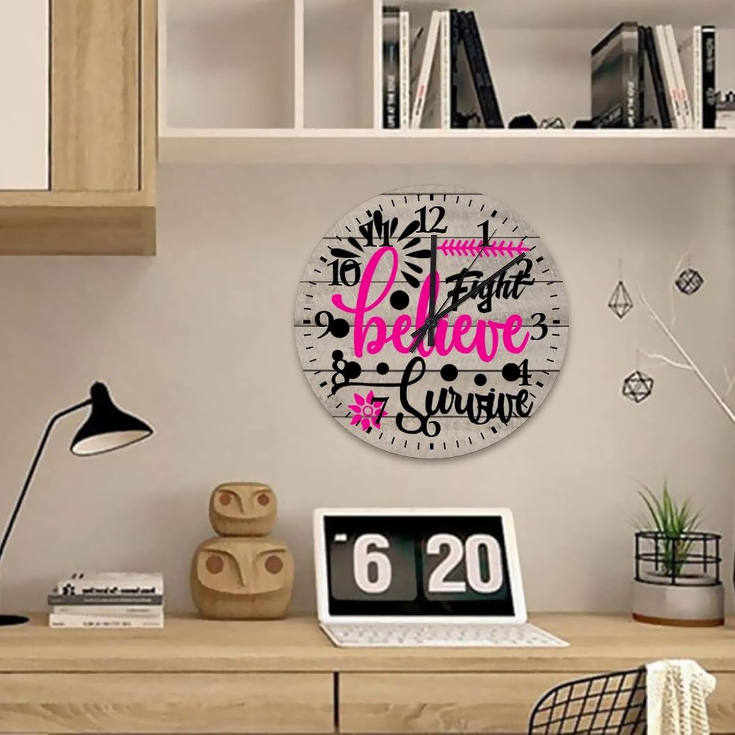 Breast Cancer Fight Believe Survive small wall clock Breast Cancer Awareness Rustic Wood Wall Clock Non Ticking Arabic Numeral Clock Dining Room Decor 15 InchDetails:Product Size: 10/12/15 inches, (25/30/38 cm)Shape:RoundMaterial: WoodFunctional Home DécorThis Breast Cancer Survivor clock aren't just for timekeeping. They function as beautiful wall decor pieces, beyond telling time, and bring both style and purpose to any room.A charming home decoration, very suitable as a housewarming gift, making the home more warm. Suitable for any room, you can put it in any room such as home, living room, master bedroom, kitchen, bathroom, home office. Elegant, durable and stylish.Clock Hands Troubleshooting Guide:Check that the battery is a new battery and not a used battery.Make sure the hour and minute hands are not crossing or touching each other. If they are, adjust the hands by slightly bending them.See if the center pin that holds the hands together is firmly pushed in or screwed on, depending on the style.If hands are still not moving after the above, please reference the hands replacement instructions included with all of our open face clocks.