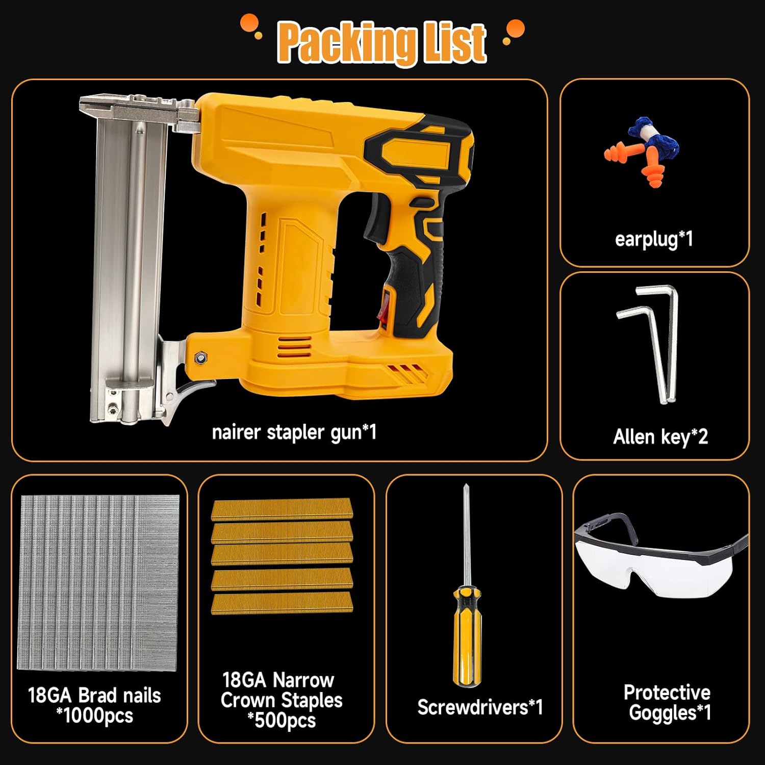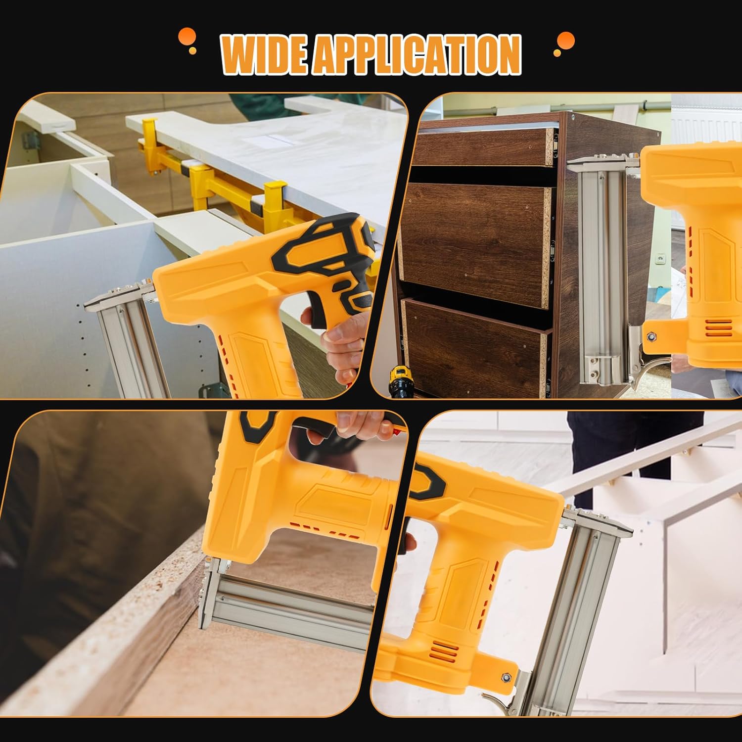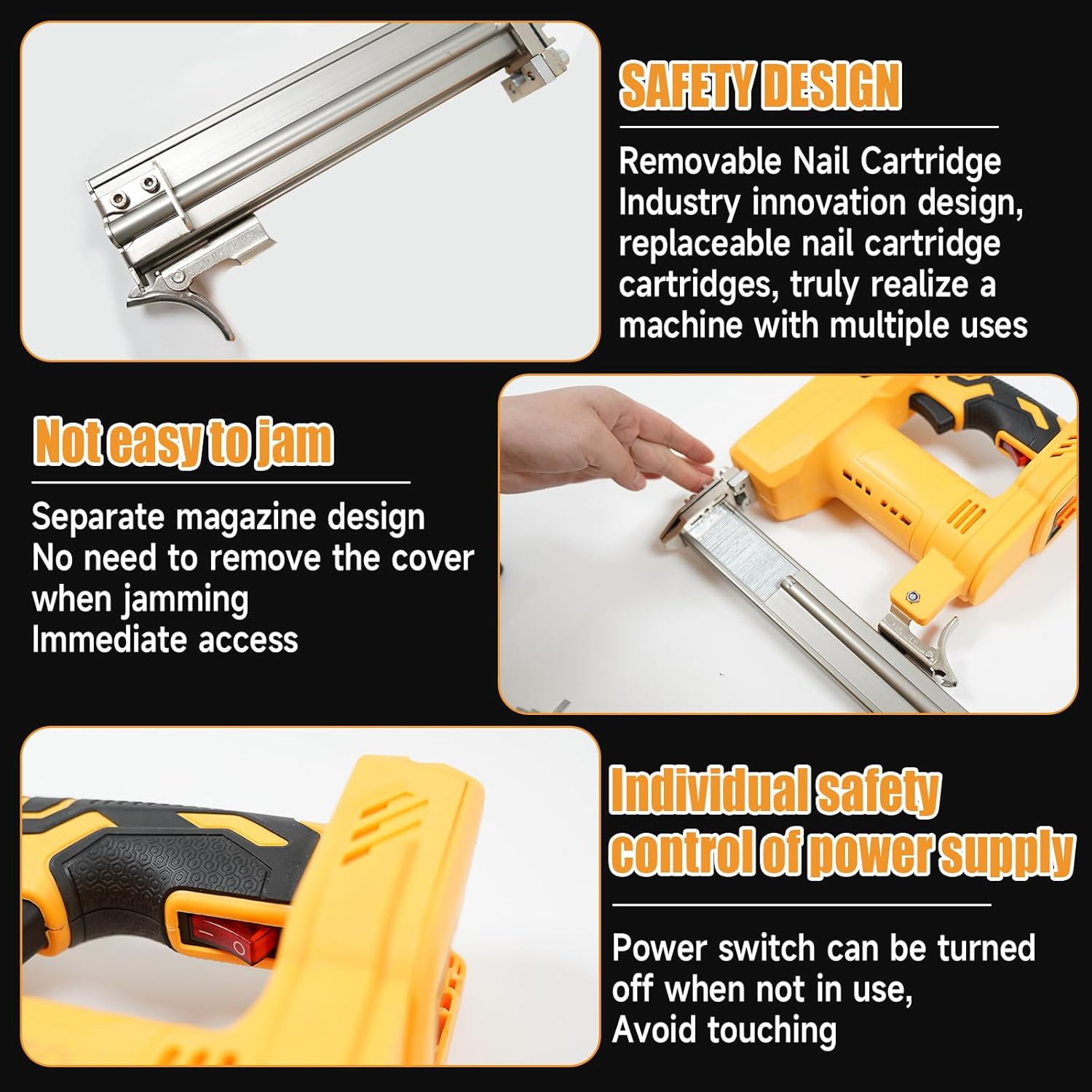 Use Step: Step 1 Press lever while pulling slider backwards. Step 2 Correctly placed staples or nails. Step 3 Slide the magazine forward until it clicks into place. Step 4 Install 20V2.0AH battery Note: Two-Handed Operation This product does not include an air pump and may cause slight recoil. Nails may pop out due to recoil, not weak nailing force. Use both hands to press the nail head firmly against the work surface until finished.
