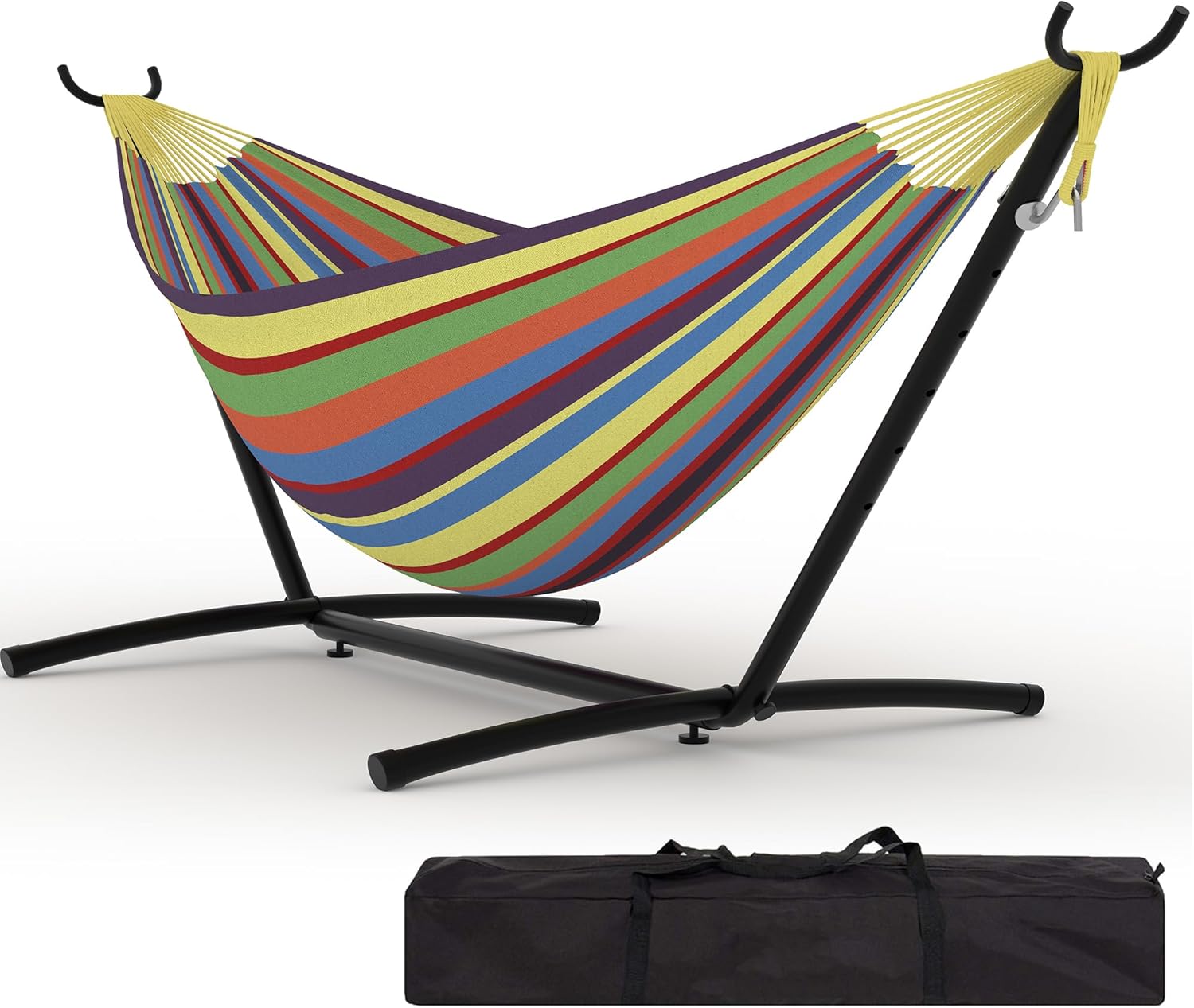 Experience ultimate relaxation with our 2 Person Outdoor Hammock with Stand, designed to bring comfort and style to your patio, backyard, garden, or beach outings. Crafted with durable cotton rope and a soft polyester pad, this hammock offers a cozy and breathable resting spot for two. The adjustable steel frame provides sturdy support and easy setup without the need for trees or additional hardware, making it perfect for any outdoor space.Key Features:Spacious Design: Comfortably accommodates two people, ideal for couples or friends to relax together.Durable Materials: Made with high-quality cotton rope for breathability and a soft polyester pad for extra comfort.Adjustable Steel Frame: Sturdy and rust-resistant frame that can be adjusted for optimal tension and height.2-in-1 Versatility: Use as a traditional hammock or remove the pad for a classic cotton rope experience.Portable and Easy to Assemble: Lightweight frame and hammock components make it easy to move and set up anywhere.Weather-Resistant: Designed to withstand outdoor elements, ensuring long-lasting use.Enhance your outdoor living space with this stylish and functional hammock that combines comfort, durability, and convenience. Whether you're lounging in your backyard, enjoying a sunny day at the beach, or relaxing in your garden, this 2 Person Outdoor Hammock with Stand is the perfect addition for peaceful moments and quality time outdoors.