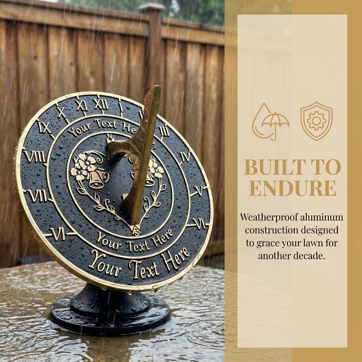 This personalized sundial is a permanent outdoor keepsake crafted to honor twenty-five years of marriage. Custom engraved across four distinct zones with names, dates, a meaningful quote, and a center logo or design of your choice. Available in aluminum or solid brass, in four sizes and five finish colors — a distinctive silver jubilee gift built to last through every season.Four Personalization Zones: Top text, bottom text, outer lower rim text, and a center logo or custom designTwo Material Options: Lightweight weatherproof aluminum, or warm solid brass that develops a rich patina over timeFive Finish Colors: Black, White, Green, Blue, RedFour Size Options: 5.9 in (15 cm), 7.9 in (20 cm), 11.81 in (30 cm), 15.75 in (40 cm)Built for Outdoor Display: Weatherproof construction suitable for garden, patio, lawn, deck, and porch year-roundPersonalization Zones:Top Position: Custom text line — e.g. "Emma & Daniel" or "Married 1999"Bottom Position: Custom text line — e.g. "25 Years of Love" or your anniversary dateOuter Lower Rim: Custom text line — a quote, vow line, or family nameCenter: Custom logo or design — initials monogram, family crest, or personal artworkSize Guide:5.9 in / 15 cm: Tabletop, small patio corner, or indoor shelf display7.9 in / 20 cm: Garden bed border, deck accent, or porch display11.81 in / 30 cm: Lawn centerpiece or backyard focal point15.75 in / 40 cm: Grand garden statement piece or sweeping yard installationIdeal For: 25th wedding anniversary, silver jubilee celebration, vow renewal, gift for parents or in-laws, husband or wife, and garden decor lovers.Please Note: This is a made-to-order custom product. Submit your personalization details — text lines and center design — after checkout. For best results, provide high-resolution artwork for the center logo or design zone.
