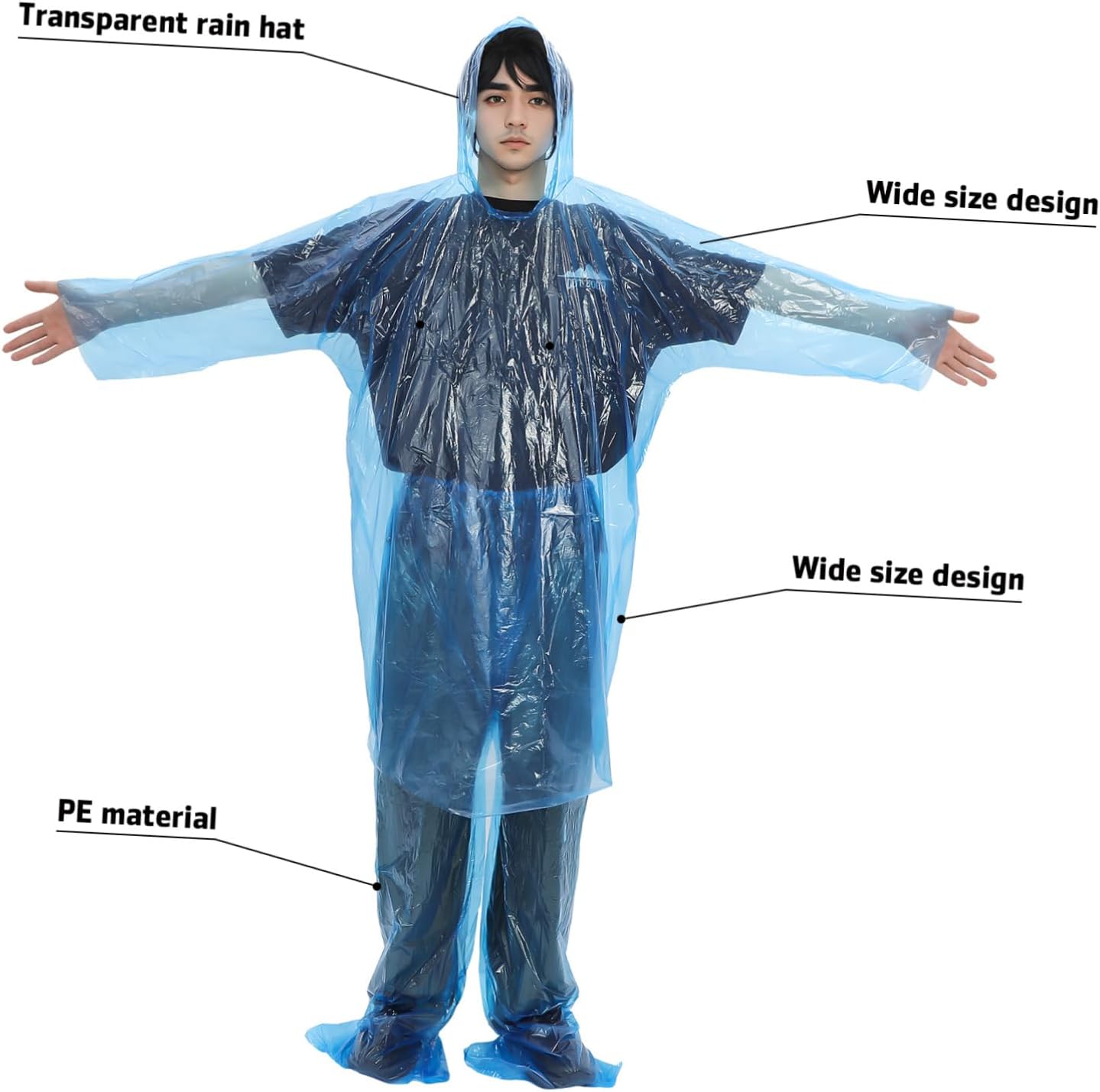 Package List 10 10 x pants Features -Color:Assorted color Raincoat For Women -Suitable for people: 130-220cm, 40-110kg Rain Suits For Men -Size: 130.00X59.00X1.00cm/51.09X23.19X0.39in Raincoat For Men - Strong and tear-resistant: This strong construction allows that the rain coat can withstand use without tearing, offering long-lasting and comfort Clear Rain Ponchos. - Versatile Use: Suitable for a wide range of outdoor activities, the rain poncho is suitable for hiking, camping, and other occasions Clear Rain Coats. - Compact Storage: When not in use, the rain poncho can be easily folded into a small, compact size, easy to pack in your backpack Rain Coat Clear. - : The sealed pant legs and thick material of the rain poncho allows no water seeps through, keeping you dry Clear Rain Jacket. - Comfortable Wear: The poncho is crafted with soft PVC material, offering a comfortable and long-lasting wearing experience Clear Rain Coat. -Material:PE, PVC Rain JacketGoods DescriptionMens Rain Jacket Welcome our Rain Poncho, suitable for various outdoor activities.Rain Ponchos For Adults Equipped with a hood and adjustable drawstrings, this rain poncho offers convenient coverage and a secure fit.Raincoat For Men Its transparent design not only adds a touch of style but also ensures clear visibility