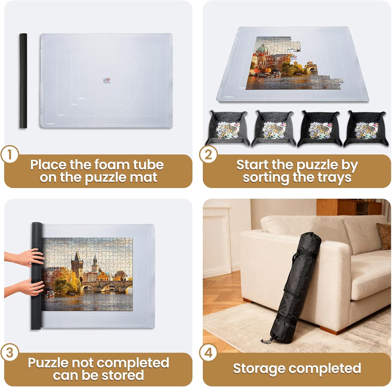 | Included Components | Gift-ready package, drawstring storage bag, rubber roll up puzzle mat, six puzzle sorting trays and foam tube, three hook and loop straps |