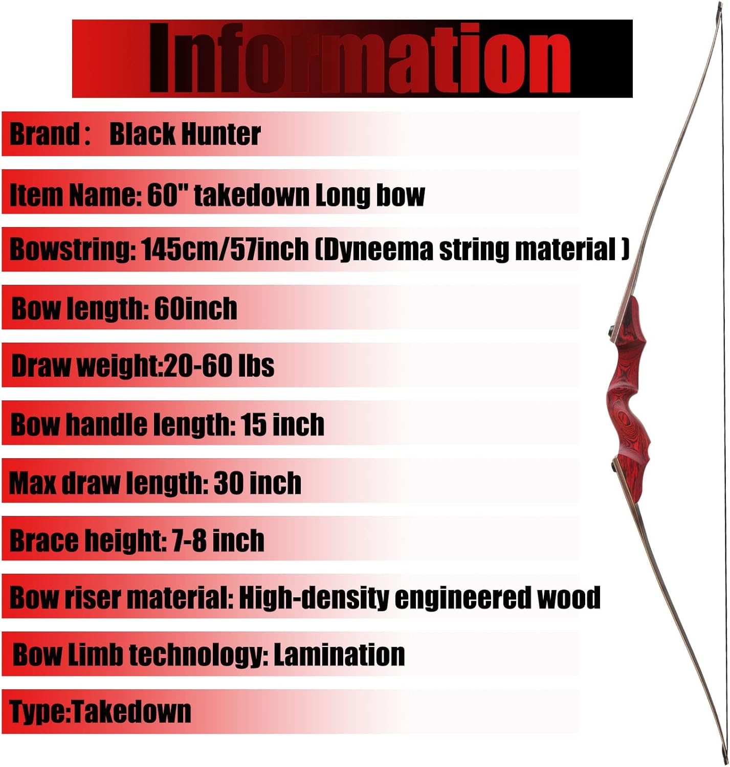 Specification Brand?Black Hunter Item Name: 60" takedown longbow Draw weight:20-60 lbs Bow length: 60inch Bowstring: 145cm/57inch (Dyneema string material ) Bow handle length: 15 inch Max draw length: 30 inch Brace height: 7-8 inch Bow riser material: High-density engineered wood Bow limb material: fiberglass and bamboo core Bow Limb technology: Lamination Type:Takedown Net weight: about 1kg Package : 1 x takedown longbow 1 x bow stringer 1 x arrow rest 1 x finger saver 1 x arm guard Features: 1. 20-60lbs Draw Weight, perfect for the beginner and the experienced archers. 2. Black Hunter Original longBow, quality assurance; American Hunting Bow, designed for the Archery Outdoor Hunting, Target Shooting Practice, Training Warm notice: 1.The bow is delivered with riser / limbs / string. You need to assemble them by yourself after you received them. 2.This bow isn't a toy, please never shoot at a person, it's dangerous.