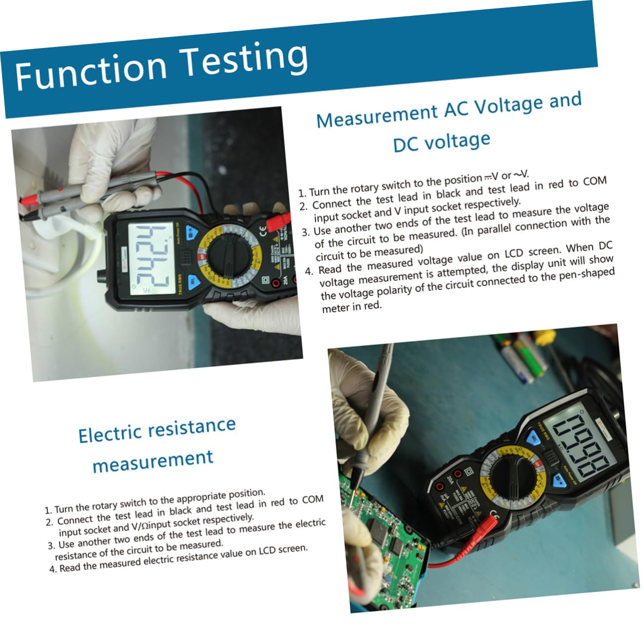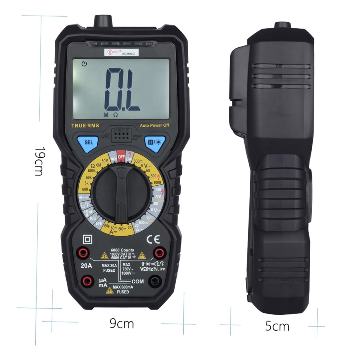 Package Include 1 x Digital Multimeter Characteristics - Voltage: 6V / 60V / 600V / 1000V (±0.8%+3) voltmeter - Display: 6000 Counts clamp multimeter - Duty cycle: 5%-95% (±2.0%+3) voltage tester - Measurement range: 0-6000 digital voltage tester - Resistance : 600ohm / 6Kohm / 60Kohm / 600Kohm / 6Mohm (±0.8%+3)/ 60Mohm (±1.2%+3) - Material: ABS - : -20℃-1000℃/-4℉-1832℉ (±1.0%+3) - Diode Test: Yes - Storage : -10~60 Celsius degree - Indicator: Yes - Color: Black - Working : 0~ degree - Backlit Display: Yes - Auto power off: Yes - DC : 60uF / 6mA / 60mA / 600mA (±0.8%+3) / 20A (±1.2%+3) - Hfe: 0-1000 (±1.0%+3) - Product size (L x W x H): 19.00 x 9.00 x 5.00 cm / 7.48 x 3.54 x 1.97 inches- Model: ADM08A - DC Voltage: 600mV / 6V / 60V / 600V / 1000V (±0.5%+3) - : 6mA / 60mA / 600mA (±1.0%+3)/ 20A (±1.5%+3) - Frequency: 60Hz / 600Hz / 6KHz / 60KHz / 600KHz / 6MHz / 10MHz (±1.0%+3)Goods Informationvoltage detector An tool for equipment testing, maintenance and repairing.digital multimeter This is ADM08A version.voltage tester It added test, floodlight, 100mF large capacitance measurement.clamp multimeter The meter measures voltage, , , resistance, frequency, duty cycle and capacitance.digital voltage tester It support Diode Testing, transistor testing, TRMS, Continuity Testing, maximum and minimum testing, backlight and data hold