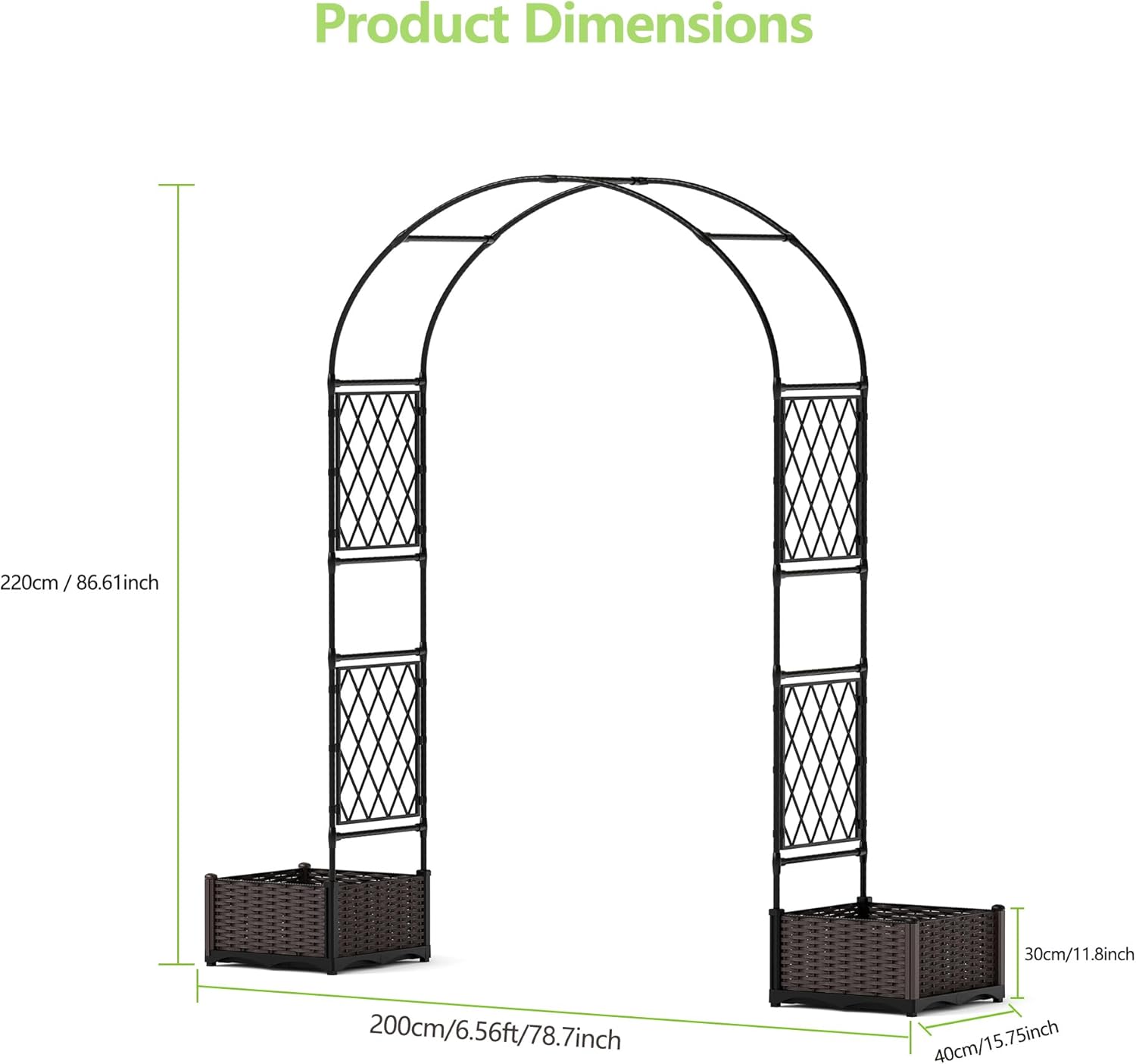 Transform your garden or special event with this elegant, weather-resistant metal arbor featuring dual planter boxes—perfect for climbing plants, weddings, and stunning outdoor decor!Highlights at a Glance:- Garden arch with dual planter boxes for vibrant displays - Weather-resistant metal wedding arbor for long-lasting beauty - Versatile garden trellis arch for climbing plants and decor - Elegant wedding arch frame for outdoor celebrations - Decorative garden archway for events, parties, and daily use - Easy-to-assemble outdoor flower arches for any spaceSpecification:Material: PE+IronDimension: 90.55x15.75x86.61 inch/78.74x15.75x86.61 inch1xMetal Garden Arch with Planter Box1xInstruction Manual1xAssembly KitNote:Please carefully follow the assembly instructions included in the package. Ensure that all parts are accounted for before starting assembly to avoid any missing components and to ensure stability.Choose a suitable location for the garden arch that provides adequate sunlight and is away from any potential obstructions. Consider the height and width of the arch in relation to surrounding plants and structures.