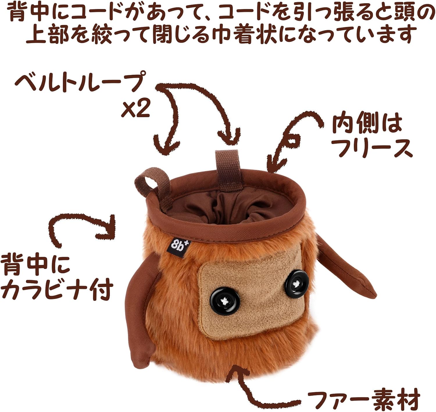 Product Features: 4.9 inches (12.5 cm) wide opening. Comes with adjustable belt and carabiner. Includes a dedicated storage bag. Drawstring closure. Includes 2 brush loop holders for both right and left handed use. Specifications: Material: 100% Polyester Weight: Approx. 4.2 oz (125 g). Country of Origin: China. Product Description: The soft pile lining helps to evenly distribute the amount of chalk Drawstring closure seals the chalk bag neatly and keeps chalk dry. The 8BPLUS Chalk Bag has been further enhanced with access slim and proper size, Easy access inside the chalk bag to add chalk while climbing. Includes brush holders on both right and left handed The handcrafted chalk bag was developed by climbers for the climber so there is no compromise on quality or functionality. Note: Please check if this product is compatible with the location, etc. If you experience any abnormalities on your skin or experience any abnormalities in your nose, mouth or eyes, please consult a physician immediately without using it. Please keep away from small children and keep away from direct sunlight, high temperature and humidity. Please do not use for anything other than its intended purpose.