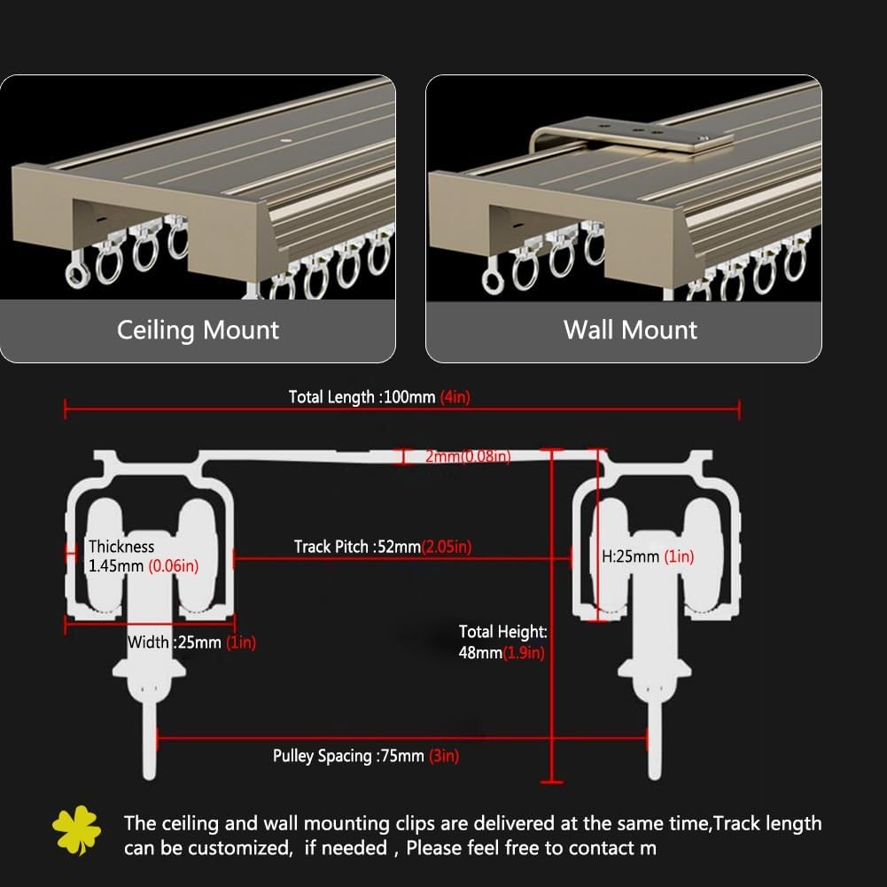 Welcome to our store! If you're looking for a robust replacement for your curtain tracks, you've come to the right place. Our heavy-duty single-piece aluminum curtain track is designed for long-lasting performance and reliability. Crafted from premium aluminum alloy, this double curtain track provides outstanding load-bearing capacity, making it resistant to bending, breaking, wear, and corrosion. It’s a perfect choice for upgrading or replacing worn-out tracks in your home or business. Our sliding curtain track features an innovative grooved design combined with silent pulleys, ensuring smooth and quiet operation every time you open or close your curtains. This design not only enhances the user experience but also adds a touch of elegance to your space. Whether you're decorating your living room, bedroom, or bathroom, or enhancing the ambiance of bay windows, RVs, hotels, or hospitals, this versatile curtain track fits seamlessly into any environment. For your convenience, please note that curtain tracks shorter than 1.6 meters will arrive as a single piece, while those over 1.6 meters will be divided into two or three sections. Each section comes with U-seamless connectors for easy assembly, ensuring you won’t sacrifice usability. Included in your package are 2 end caps per set, 20 pulleys per meter, 2 installation brackets per meter, and the curtain track itself, available in your preferred length. Elevate your space with our reliable and stylish curtain track solution today!