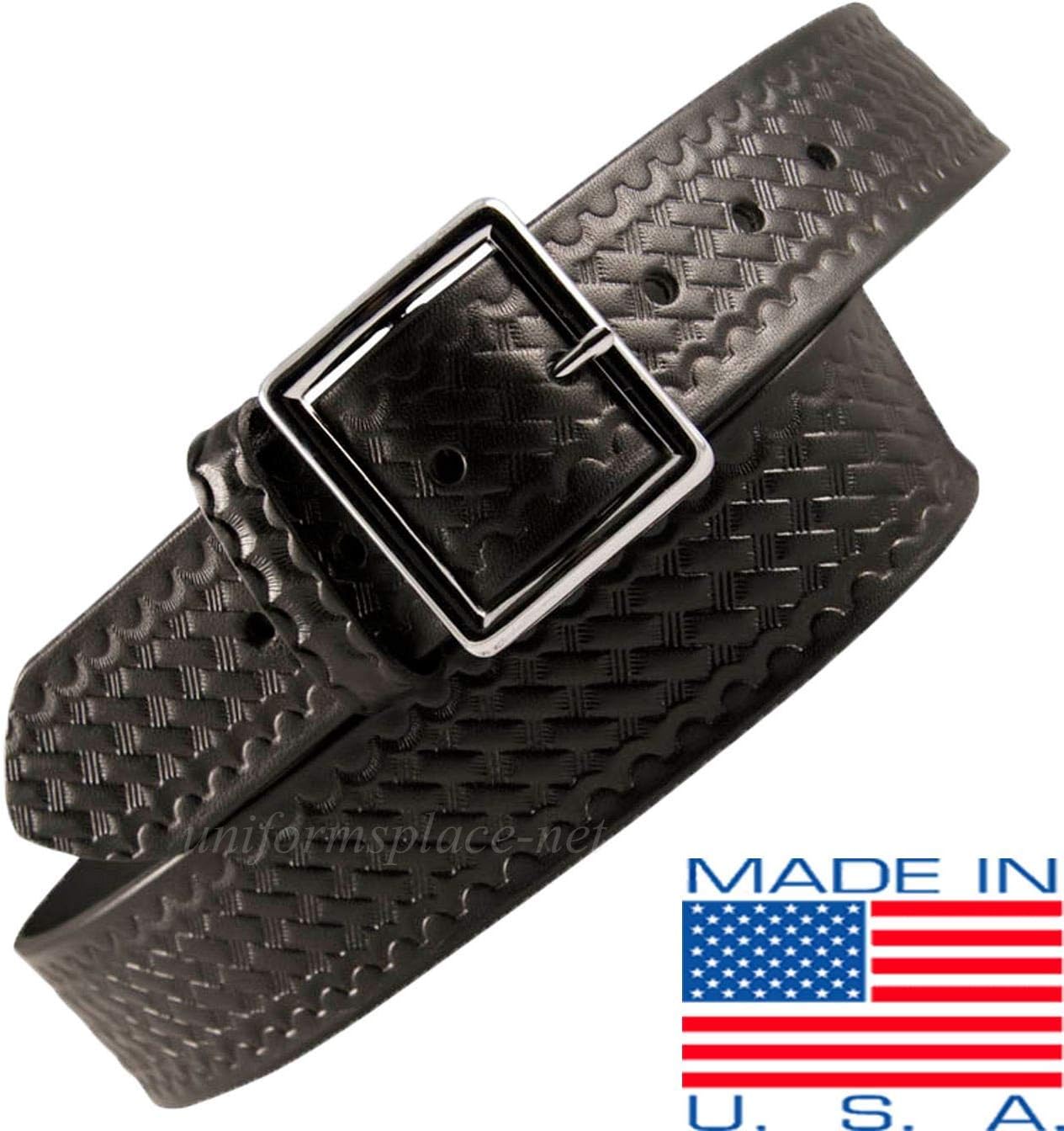 8-9 ounce struck through, top grain leather. Postal Approved if stamped, please request when ordering. Color: Black. Size: 46. Finish: Basket Weave. Hardware: Nickel.