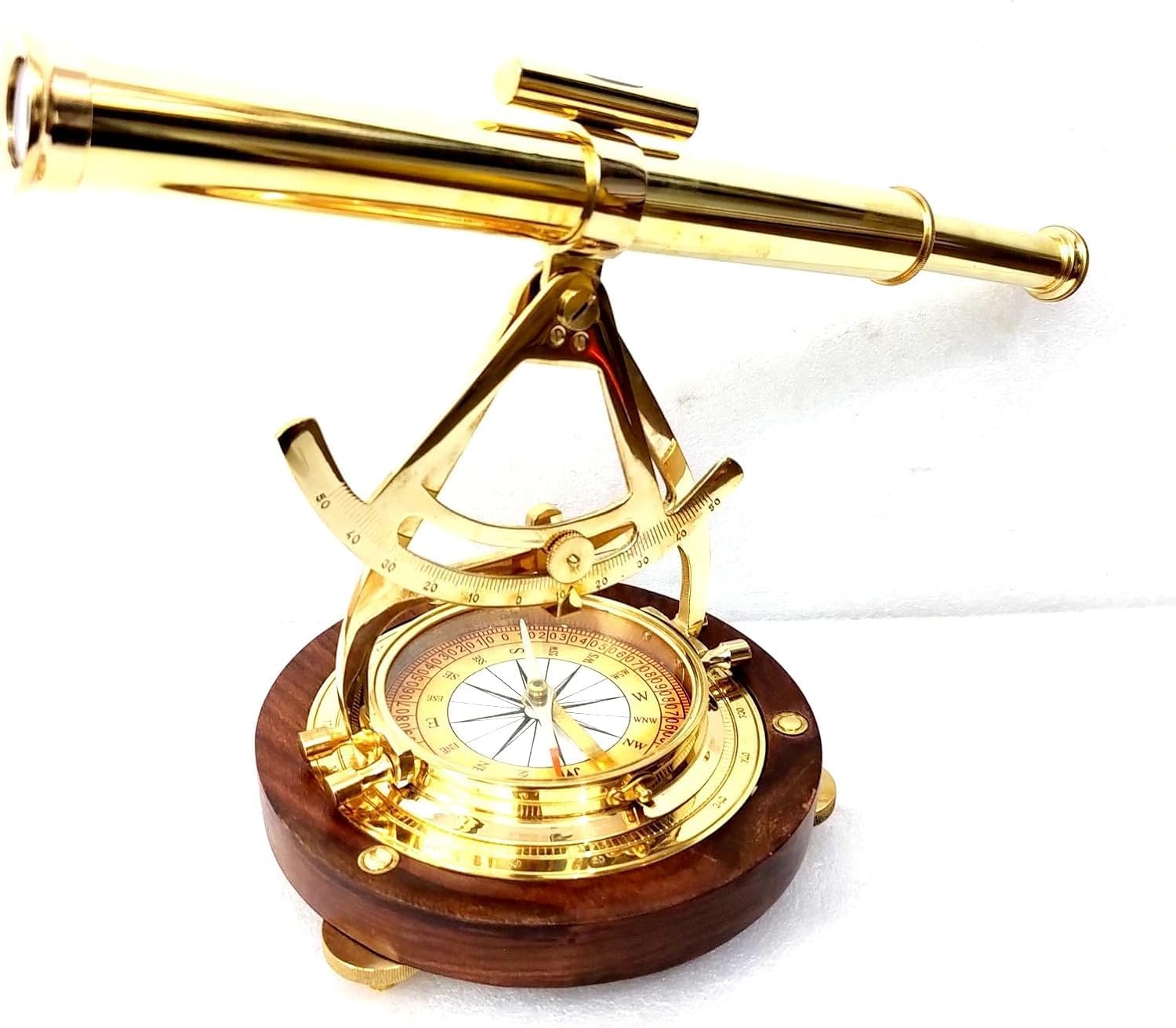 This exquisite brass alidade telescope with navigation compass is a masterpiece of traditional surveying instrumentation. Featuring a polished brass construction mounted on a rich wooden base, this 14-inch alidade combines functionality with decorative appeal. The precision-crafted compass face displays clear directional markings, while the adjustable sighting mechanism allows for accurate measurements and navigation. The device includes a detailed sundial compass component, making it both a practical tool and a sophisticated display piece. The instrument's robust construction, measuring approximately 2.05 inches in width, ensures durability while maintaining its elegant appearance. Perfect for collectors, maritime enthusiasts, or as a distinctive decorative element, this navigation instrument seamlessly blends historical craftsmanship with practical functionality. The combination of gleaming brass and warm wood creates an impressive presentation that would make a remarkable gift for those who appreciate fine nautical instruments or classic surveying tools.