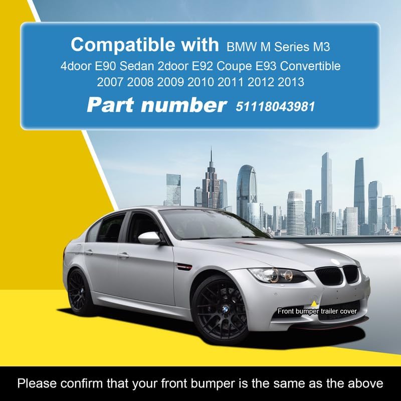 This product is suitable for BMW M Series M3 4door E90 Sedan 2door E92 Coupe E93 Convertible 2007 2008 2009 2010 2011 2012 2013 Part number: 51118043981 This accessory is located on the right side of the Front bumper of the vehicleOur products are all brand new, please rest assured to purchaseAs shown in the picture, we have multiple colors for you to choose from. If you don't have the color you need or are unsure about the color of your original car, you can purchase an unpainted one and paint it yourself Our product is made of ABS plastic advanced materialsThe installation method is very simple, just align and lock the card slotNotice before purchase:1.Please confirm that your car is consistent with the car shown in the picture before it can be used. If it is different, it cannot be used. If you are unsure, please consult us for confirmation .2.Color difference issue: our colors are matched based on the new car's original color chart, but many original car paints are metallic, which we cannot achieve. The colors of new and old cars may also differ.Our new paint will be slightly darker than your original paint color because your car's color will become lighter after experiencing wind and sun exposure, which is a normal phenomenon, We have made every effort to approach the original color of the car, but there may be some errors. We hope the car owner can accept and understand.3.Suitable question: The covers of each of our vehicle models have been tested and perfectly fitted with the original bumper before being sold, and many of them are still original factory parts. So as long as your bumper is original and has not been replaced later, our cover is confirmed to be usable.4.Our accessories are all made from original car data molds, not original car parts, but the quality is excellent. If you mind, please consider carefully