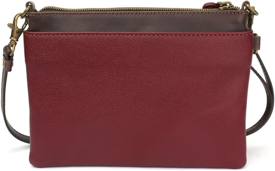 Convenient, Versatile, Compact Front zipper pocket with Chevron Cross Chala Pal Detailed stitching and decorative zipper pull Rear slide pocket 3 credit card slots inside 2 Adjustable straps that are detachable Top zippered pocket Patterned fabric lining with inner slide and zipper pockets. Materials: Faux Leather Color: Maroon Approx. Measurements: 8"W x 6"H x 0.5"D Strap adjustable: 7"-32"
