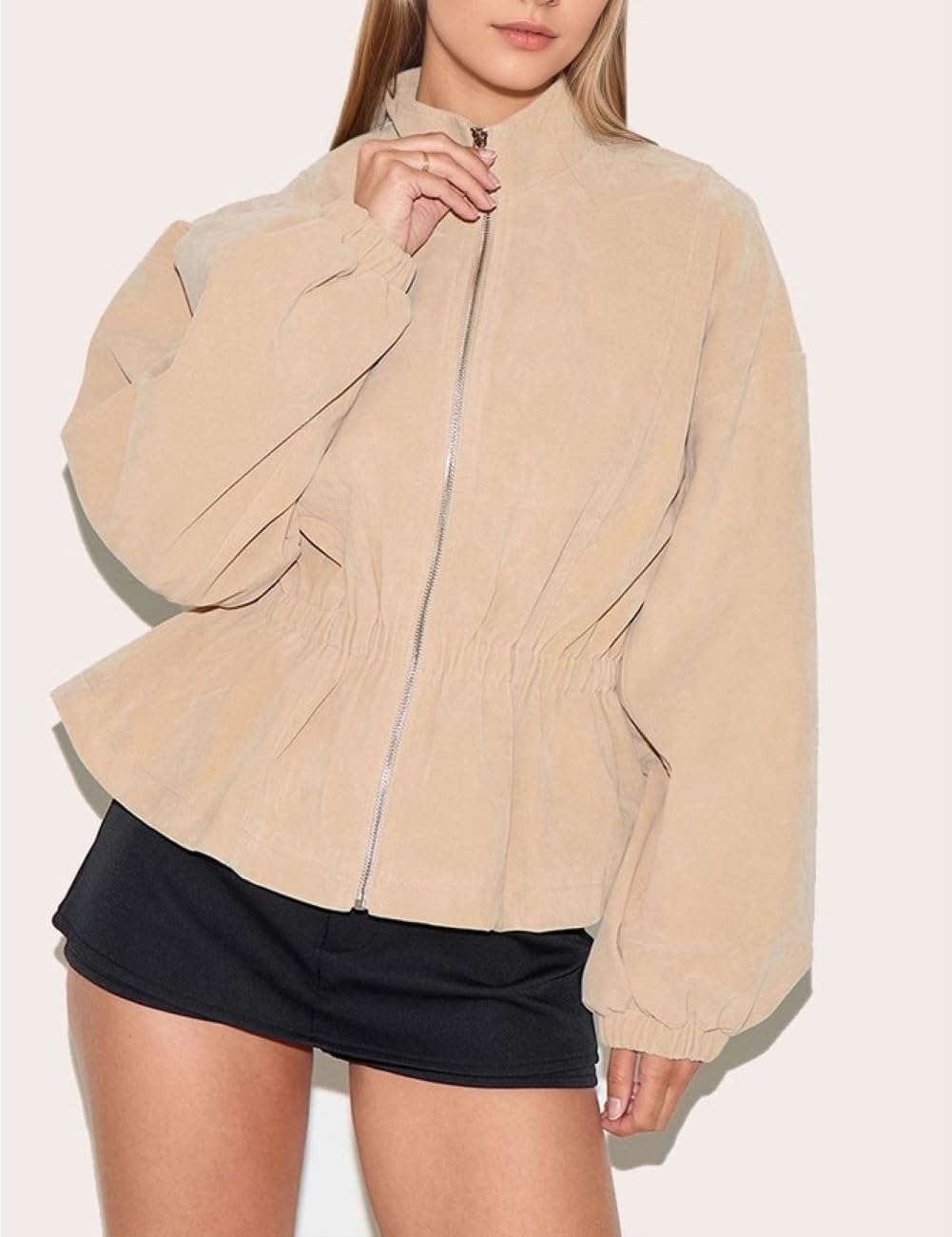CHARTOU Women Shirred Waist Jacket/ Oversized Fall 2025 Outfits/ Band Collar Mock Neck Outwear Coat/ Front Zipper Coat Jacket/ Chic Ruffle Hem Fall Winter Vacation Clothing