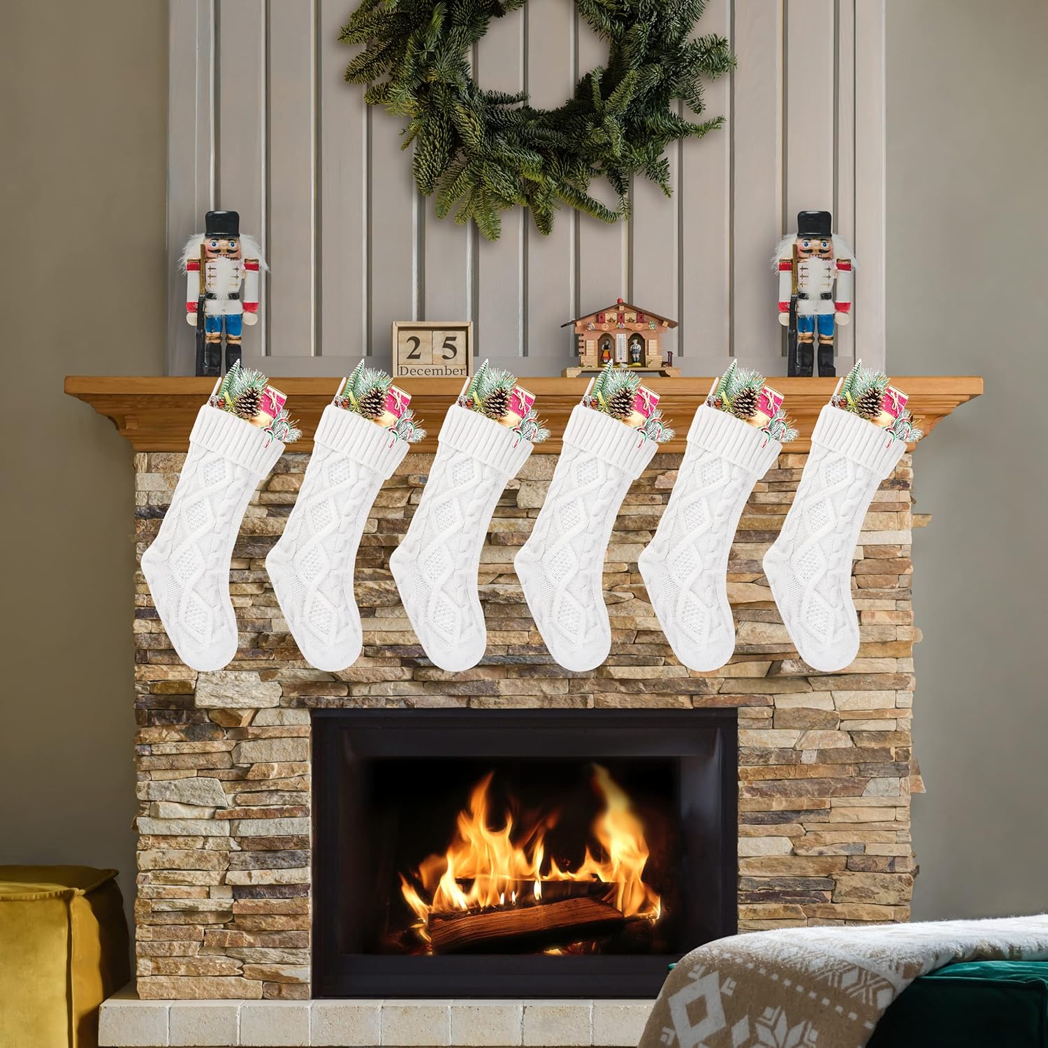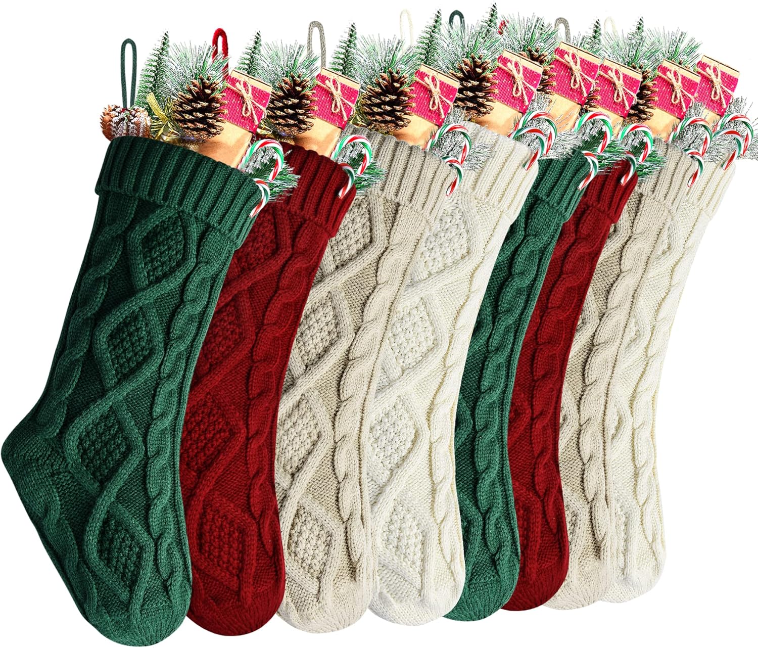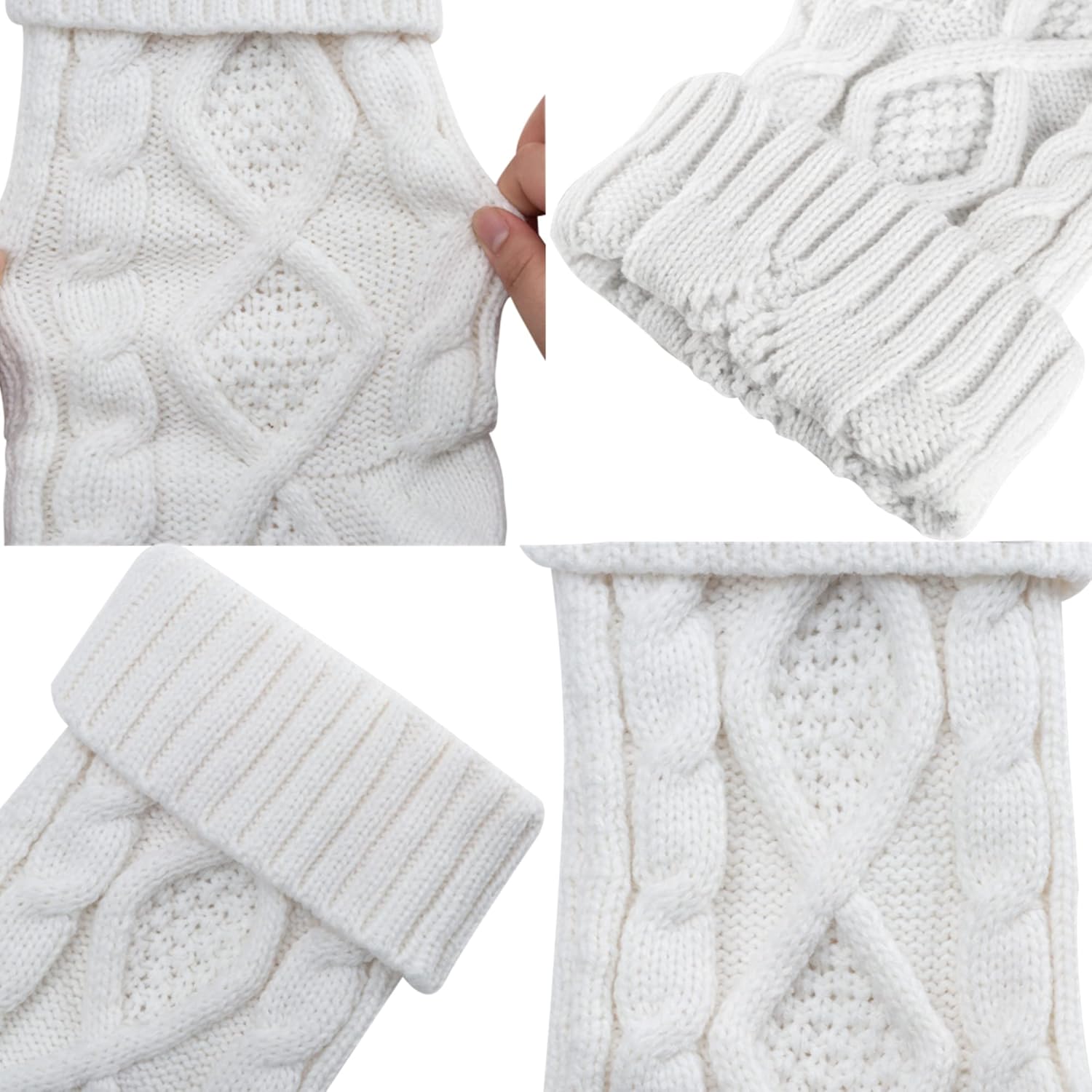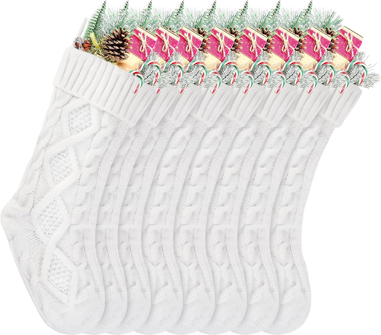 Specifications: Size:18 inches *5 inches Color: White and Blue Material:Heavy woolen yarn Features: 1. Classic rustic cable knitted Christmas stockings. 2. Made by thick heavy woolen knitted yarn giving you an old fashion Christmas and cozy feeling. 3.18" standard size Christmas stockings for kids adults, large enough to hold many small gift, for you to fill candies or chocolates, watch, folding wallet, ties, gift cards, small toy cars, etc. 4.Ready to stuffed and hang on stocking hangers or mantle clips on fireplace mantel. Handmade style to create beautiful holiday memories for generations to come! Makes the perfect gift for family and friends.Great addition to holiday season decorations. 5.WITHOUT LINING.Made by thick high quality woolen yarn so the stockings will hold the shape when stuffed Recommendation: 1.Custom monogram stockings by embroidering name on the top of the Christmas stockings.It also looks awesome by hanging name lable on the Christmas stockings. 2.Great addition to Christmas decorations. Also a nice present for your family and friends. 3.Charming when hanging on the mantel or stairs 4.The knitted patterns are place in BOTH SIDE, you can hang it from left to right or from right to left to make your own unique Christmas decoration. Package Includes: 8 x 18" heavy yarn stockings, included 4 pack White and 4 pack Blue Christmas stockings Note: More beautiful Christmas stockings are in our storefront.Have a check.