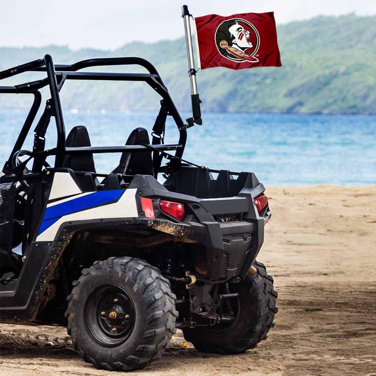 Florida State Seminoles Boat and Mini Flag and Flag Pole Holder Mount Set includes a 12x18 inch Golf Cart Flag, Adjustable Bracket, 2-Piece Flag Pole, and all Clips and Hardware for Mounting on your Golf Cart Frame or other Uses. The Golf Cart and Boat Flag flag is made of 2-ply 100% Polyester with double sided screen printed logos which are viewable and readable correctly on both sides. The Adjustable Bracket is made of molded PVC and 2-Piece 30 Inch Flag Pole is made of 0.48mm Stainless Steel for Durability. Four (4) Changeable Molds allow you to mount Bracket onto Square or Round Frames up to 1.75 Inches in Width. Golf Cart Flag is Officially Licensed and this Golf Cart Holder and Flag Set is great for Golf Carts, ATVs, Canopies, Porch Railings, and Other Uses to Display your Team Spirit.
