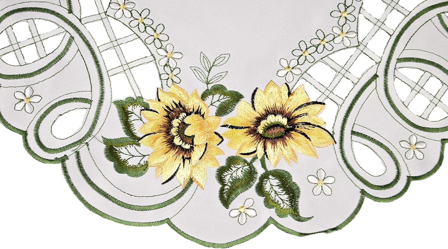 Brighten up table decor with this beautiful 15″ Round Embroidered Cut Work Sunflower with lovely green cut work Doily. Add a runner or place mats and it will complete your decor. 100% ivory polyester with beautiful cut outs. Would make a stunning decoration for your Dinning Room or Kitchen Table. ** All sizes may vary with cut work pattern from a quarter inch to three quarters inch.**