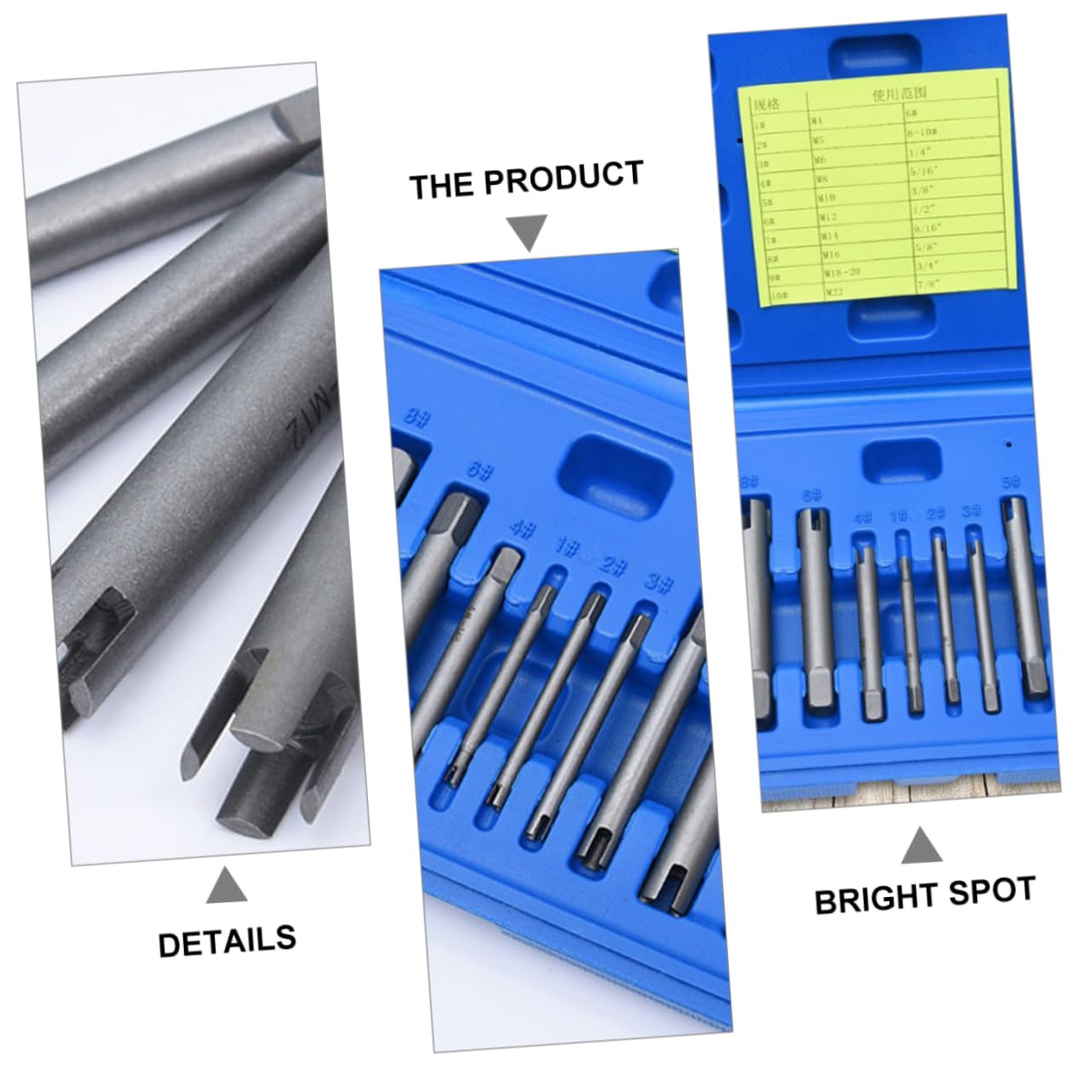Package List 10x broken screw extractors, 1 x storage box Characteristics -Material: Alloy stripped screw tap extractors. -Note: with/without label alloy screw extractor kit -Size: About 8.00X1.79X1.79cm / 3.14X0.70X0.70inch screw extractor supplies. -Color: Silver repairing tools. -It is convenient to when using, if the tap is too tight, it will break easily broken tap removers -With carrying box, easy to carry and store, you can fine the tool you need easily screw remover tools -Made of alloy material, overall heat treatment, strong and durable for use damaged bolt removers -Each tap extractor is specifically engineered for grab-it and easy out broken screw taps broken head screw removers -Ideal tool set for removing broken screws / bolts, slipped screws/bolts and rust bolts damaged extractorsGoods Descriptionbroken head tap extractors Each tap extractor is specifically engineered for grab-it and easy out broken screw taps.durable screw removers With carrying box, easy to carry and store, you can fine the tool you need easily.sturdy screw extractors tool set for removing broken screws / bolts, slipped screws/bolts and rust bolts.alloy screw extractors Made of alloy material, overall heat treatment, strong and durable for use.alloy screw extractor kit It is convenient to when using, if the tap is too tight, it will break easily