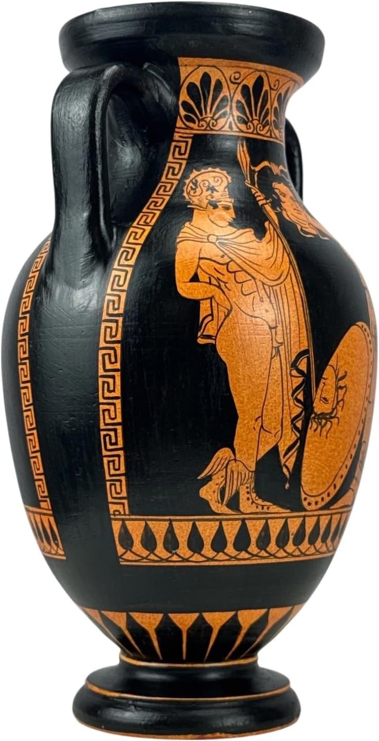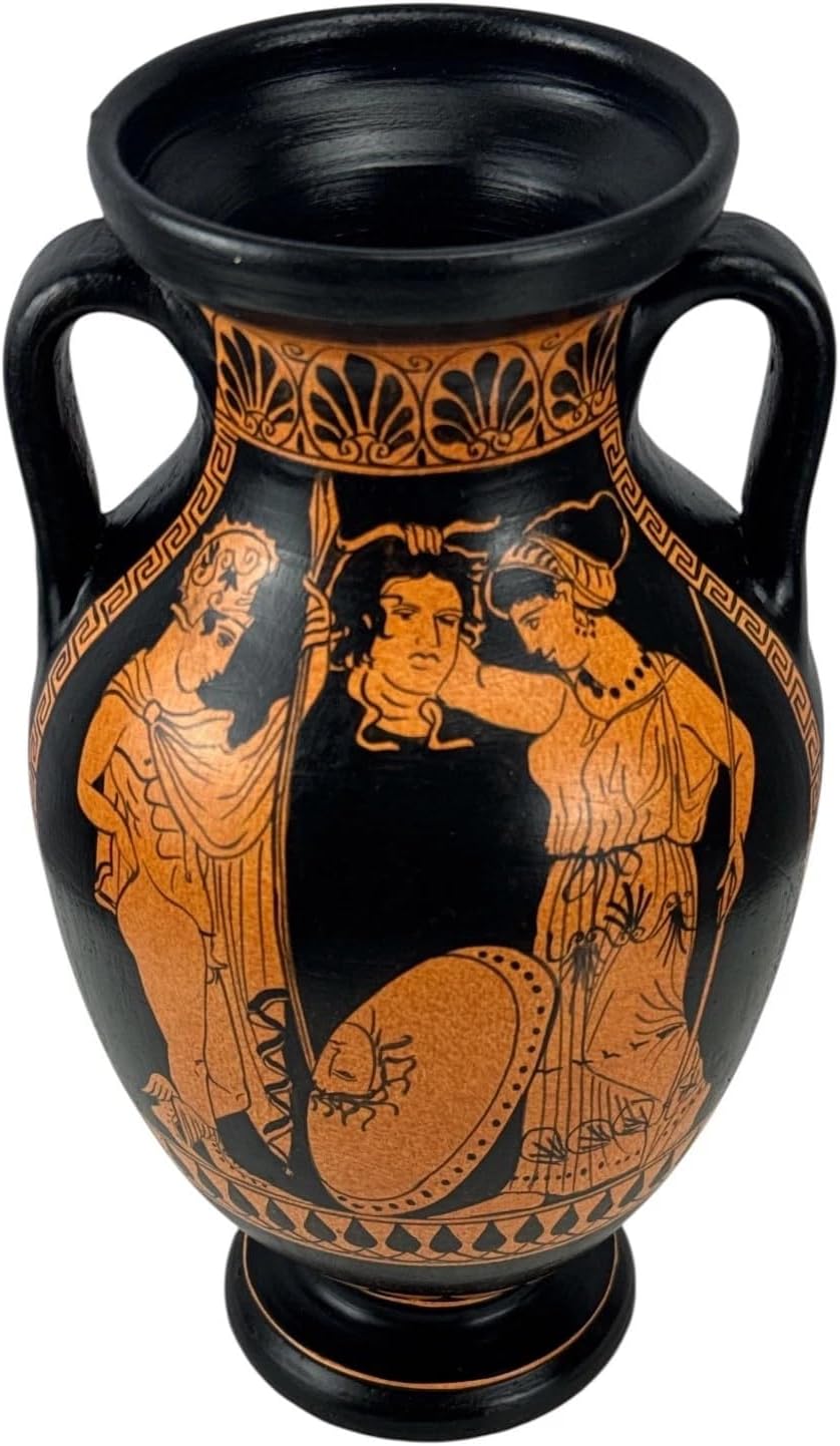 IMAGE DESCRIPTION: Side A: Medusa with snakes for hair Side B: the image is taken from a red figure krater (400 - 385 B.C.) exhibited in the Museum of Fine Arts, Boston. Athena receives the head of the Gorgon Medusa from Perseus. The hero wears the winged boots of Hermes and the cap of Hades which is depicted as a peaked Phrygian cap. Athena holds the Gorgoneion in her hand and its image is reflected in the polished surface of her shield.