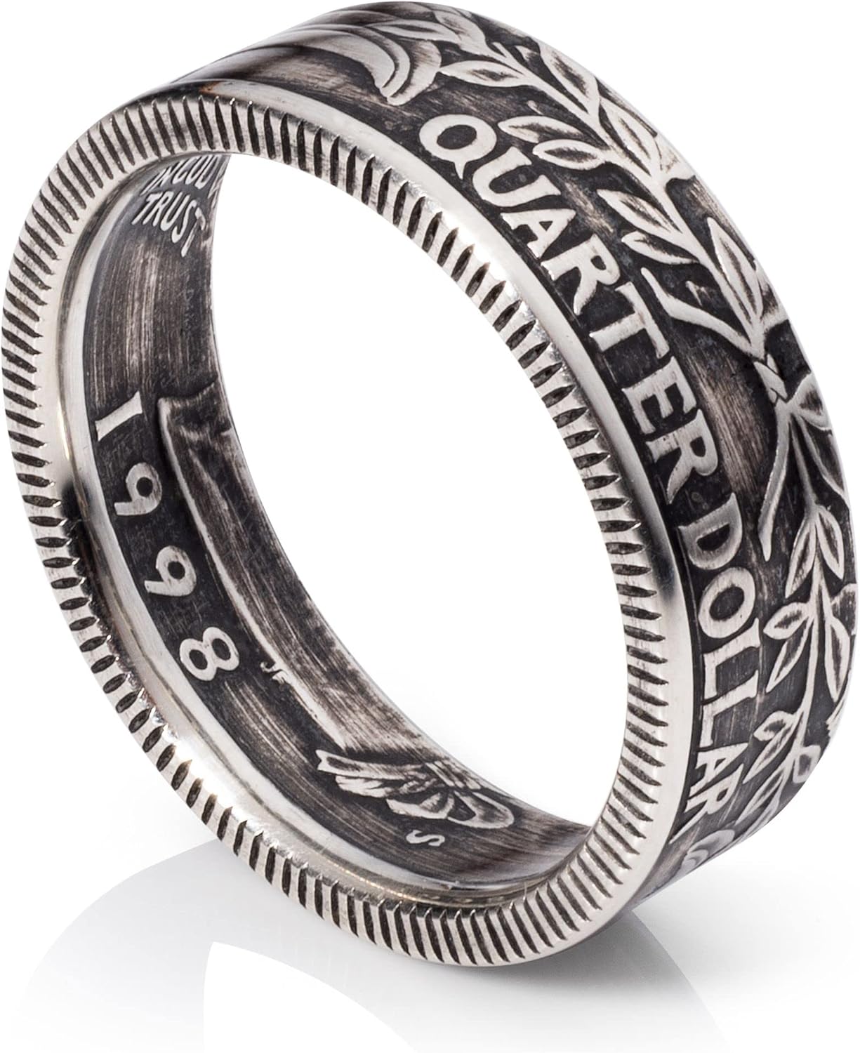 Handcrafted from premium U.S. Silver Quarter Dollars dating from 1992 to 1998, these coin rings exhibit the 'Tails' or reverse side design including the inscriptions "United States of America," "E. Pluribus Unum," and "Quarter Dollar." Each ring is meticulously shaped to ensure a smooth, comfortable fit with both inside and outside edges carefully rounded. Attention is given to the reeded edge, making it slightly thinner yet utterly smooth, a characteristic feature of coin rings. A slight taper on the inside due to the ring's thicker reeded edge is skillfully balanced by minor carving on the inside edge, preserving the original detail. The result is a symmetrical, comfortable, and superior-quality ring, making it an ideal gift for numerous occasions. Crafted with care and precision, these rings transform silver quarters into unique pieces of wearable history.