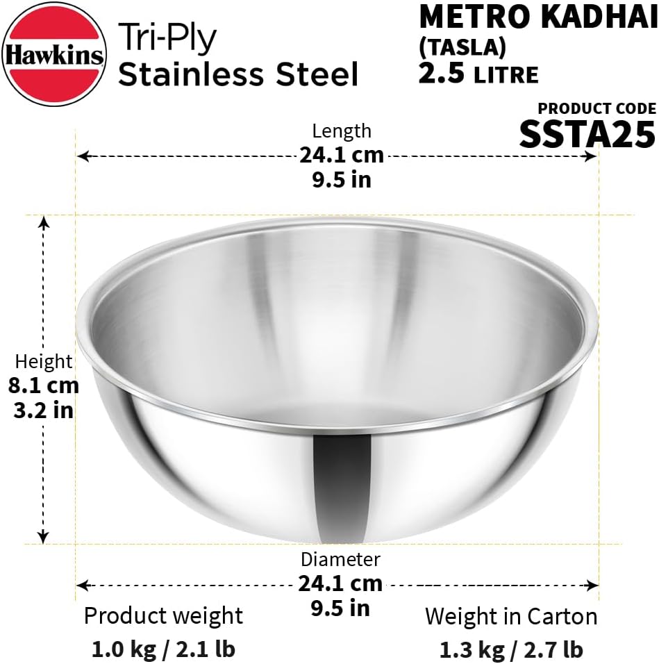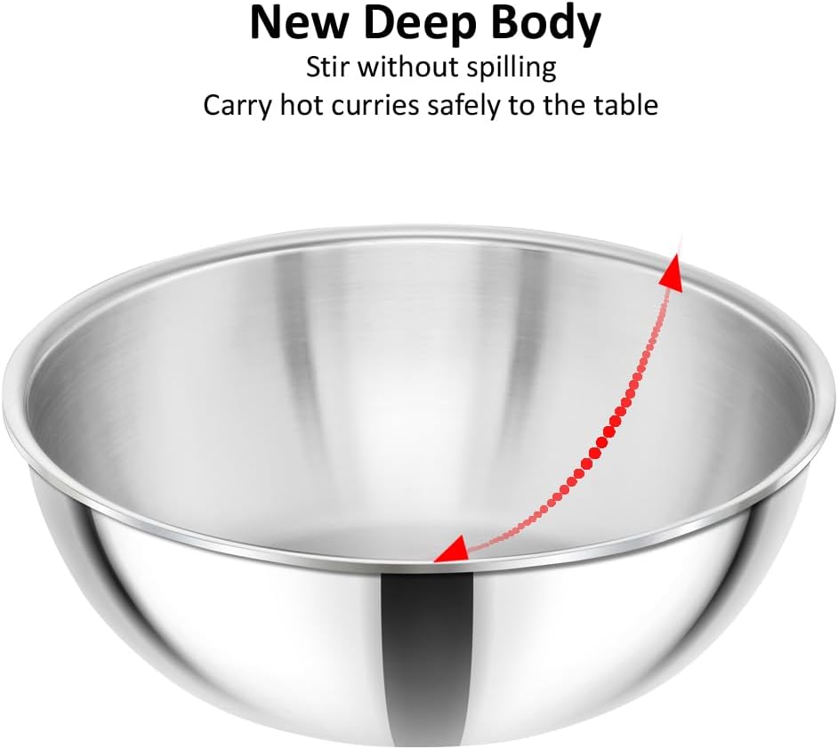 Advanced 3 mm Extra-thick Tri-Ply Stainless Steel - Spreads heat up the walls, food does not burn and stick New Deep Body - Stir without spilling, carry hot curries safely to the table Space-saver, Stackable Design - 1.5 to 6 Litre, fits well within each other No Rivets - Easy to clean, easy to stack Ezee-Pour, No-Drip Flange - Pour or slide food without spilling"