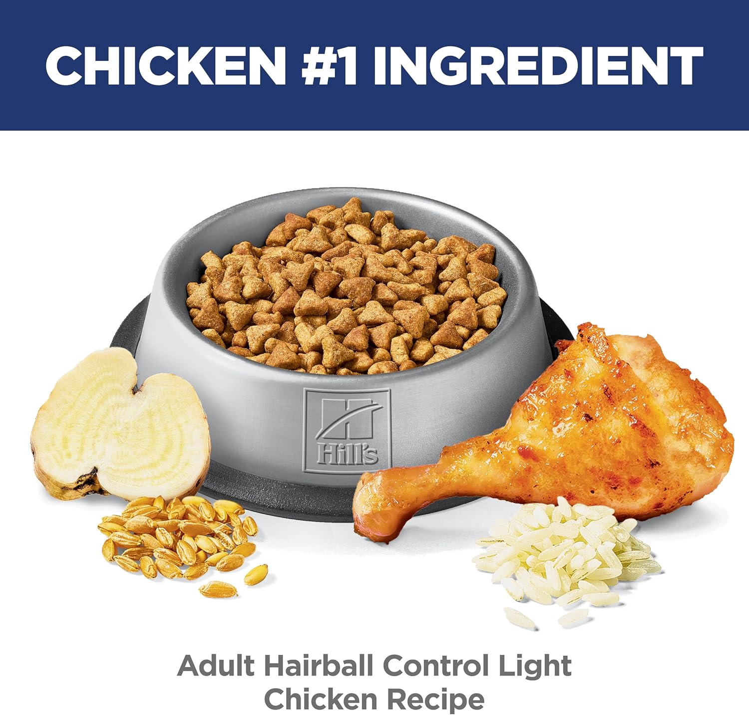 Product Description Hairballs are a natural occurrence for cats, but if they're more frequent than you'd like, you may need a nutritional solution. Hill's Science Diet Adult Hairball Control Light Chicken Recipe dry cat food provides nutrition to help avoid hairball formation for cats who would benefit from a lighter, healthy lifestyle. This cat food made from natural ingredients contains 13% fewer calories vs. Hill's Science Diet Adult Hairball Control, giving your grown cat a low-cal source of high-quality protein. The natural fibers are easy to digest, and work to comfortably reduce your adult cat's hairball issues. From the Manufacturer Hill’s Pet Nutrition’s Mission: To help enrich and lengthen the special relationships between people and their pets. More than 220 veterinarians, food scientists, technicians and Ph.D. nutritionists at Hill's develop all of Hill's pet foods to meet the needs of your pets. Hill’s only accepts ingredients from suppliers whose facilities meet stringent quality standards and who are approved by Hill's. Not only is each ingredient examined to ensure its safety, we also analyze each product's ingredient profile for essential nutrients to ensure your pet gets the stringent, precise formulation they need.Hill’s uses only high-quality ingredients including real chicken, lamb or salmon protein. Hill’s dry pet foods have quality protein as the first ingredient and provide clinically proven antioxidant benefits. Plus, they’re made with natural ingredients (plus vitamins, minerals & amino acids) and never contain artificial colors, flavors, preservatives or chicken by-product meal.Hill’s Food, Shelter & Love program donates food to shelters across the country, providing the proper nutrition that helps pets find their way to loving homes. With every purchase of Science Diet you help feed over 100,000 homeless pets every day, 365 days a year.