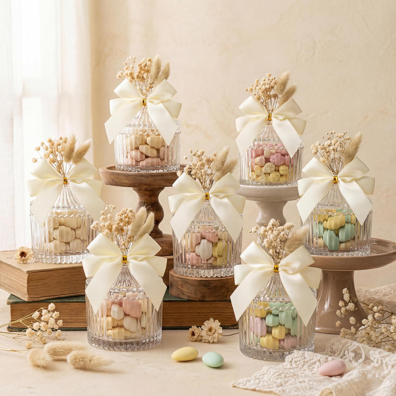 | Included Components | 12 x Glass jars ,12 x Bows ,12 x Organza bags ,1 Pack of baby's breath dried flowers. 1 pack of lagurus ovatus and 1 roll of hemp rope |