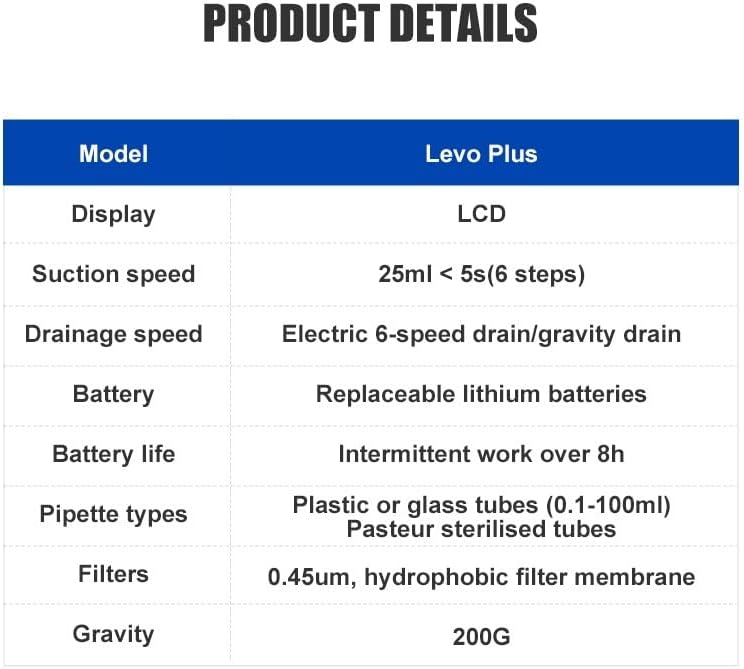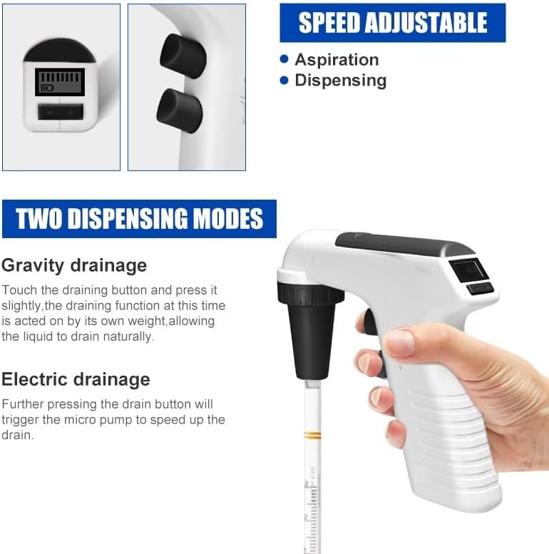 Festures:1.Intuitive and convenient speed with 6 levels2.Lightweight pipette filler compatible with glass or plastic pipettes (0.1 -100 mL)3.Ergonomic design for fatigue-free and effective streamlined pipetting4.LCD screen displays battery status and pipetting speed5.Quiet and powerful motor and pump fills 25 mL pipette in less than 5 seconds
