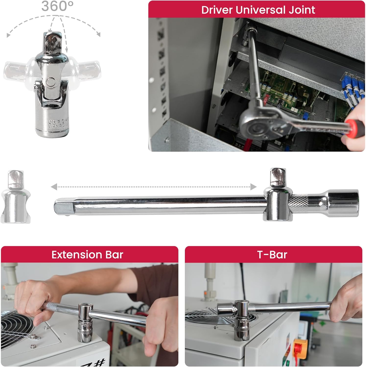 | Included Components | 1/2" & 1/4" Ratchet wrenches, A power socket adapter, Extension bar, Sockets & Bit sockets, Universal joint |