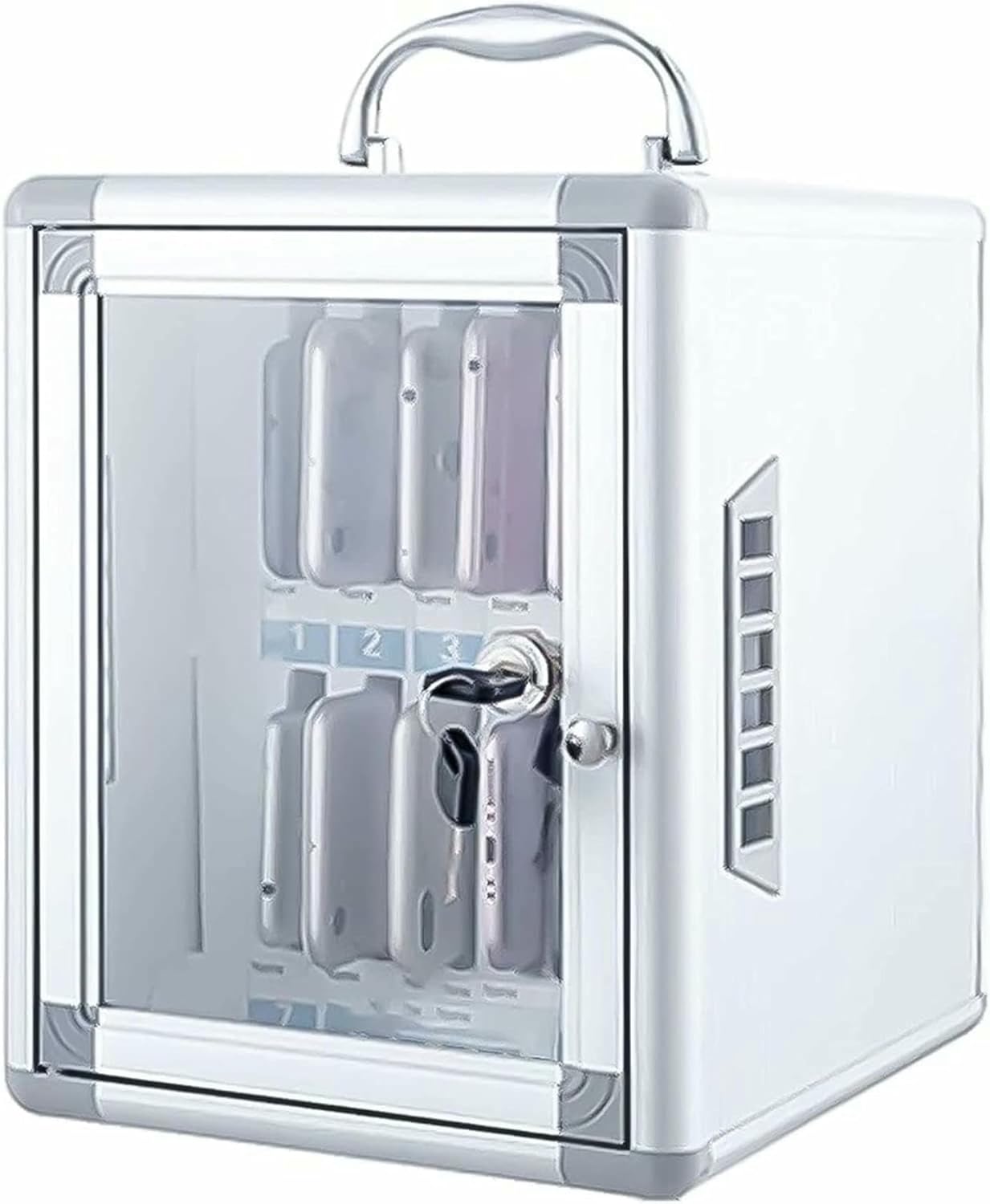 Bring quietness and efficiency to the classroom; Cell Phones Holder for Classroom you can store different types of mobile phones, centralized management of mobile phones, improve the efficiency of life and study.The cell phone box is suitable for schools, offices, meeting rooms, factories, restaurants and other public places to protect the safety of mobile phones and to centrally manage mobile phones.Product name: Mobile phone safe deposit box Product capacity: 12/24/36/48/60cm Product material: Aluminum alloy, medium fiber board, pearl cotton Design: Handle/with safety lock Installation method: wall hanging / portable Size: 21*24*27cm/8.3*9.4*10.6in 26*24*39cm/10.2*9.4*15.5in 29*24*51cm/11.4*9.4*20.1in 38*24*52cm/15*9.4*20.5in 37*24*64cm/14.6*9.4*25.2inNote: 1. About the sales list: We only sell mobile phone cabinet, excluding other products. 2. About the color: Because of the shooting tools or shooting light, there will be color difference, please refer to the actual product, not a quality problem. 3. About size: Due to different measurement methods, there may be an error of 1~2cm. Please refer to the actual product. Please understand that.