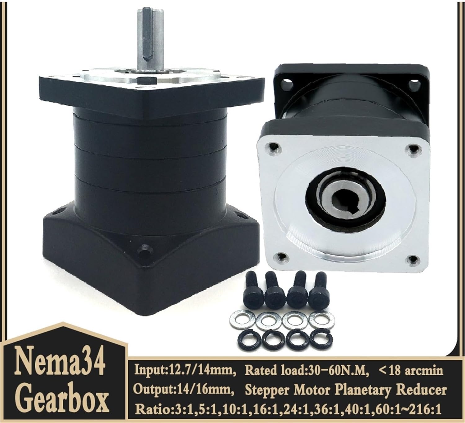 Gearboxes, Gearheads & Speed ReducersNema 34 Planetary Gearbox Gear 86mm Speed Ratio 3:1,5:1,10:1~216 Input 1/2 Inch 12.7/14mm Nema34 Stepper Motor Reducer Step-downPackage list: 1x Planetary Gearbox(Input:14mm)1x Key4x Install screws86PX Reducer Technical ParametersStageStage 1(L1)Stage 2(L2)Stage 3(L3)Speed Ratio3/4/5/6/8/1015/20/24/30/36/40/50/60100/120/150/200Input (MM)12.7/1412.7/1412.7/14Output shaft (MM)16/1416/1416/14Keyway (MM)5 5 5 Body length (MM)8095107Rated load (N.M)305060Maximum load (N.M)5080100Full load efficiency (%)959085Backlash Precision (arcmin)182535Rated input speed (RPM)300030003000Protection level (IP)656565Noise (dB)606060Average service life (H)200002000020000Gear material20Cr Carbon steel20Cr Carbon steel20Cr Carbon steel