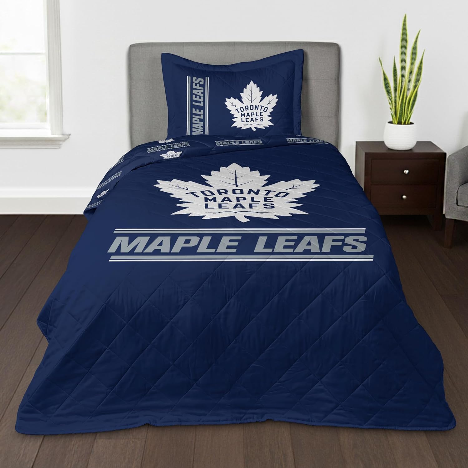 Bring the excitement of hockey season into your home with this officially licensed NHL Quilted Throw & Sham Set, the perfect bedding upgrade for fans who live and breathe their team. Featuring bold NHL graphics across a quilted 60" x 80" throw and a matching sham, this set is made to stand out in any bedroom, dorm room, or fan cave. The lightweight quilt adds an extra layer of comfort for year-round use, while the matching pillow sham create a clean, team-spirited look. Great for kids, teens, and adult hockey fans alike, this set is both stylish and functional—and machine washable for easy care. Whether you're gearing up for game day or gifting your favorite fan, this NHL bedding set delivers on both comfort and team pride.