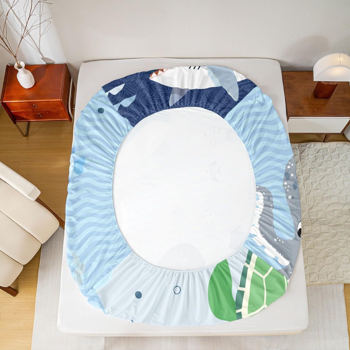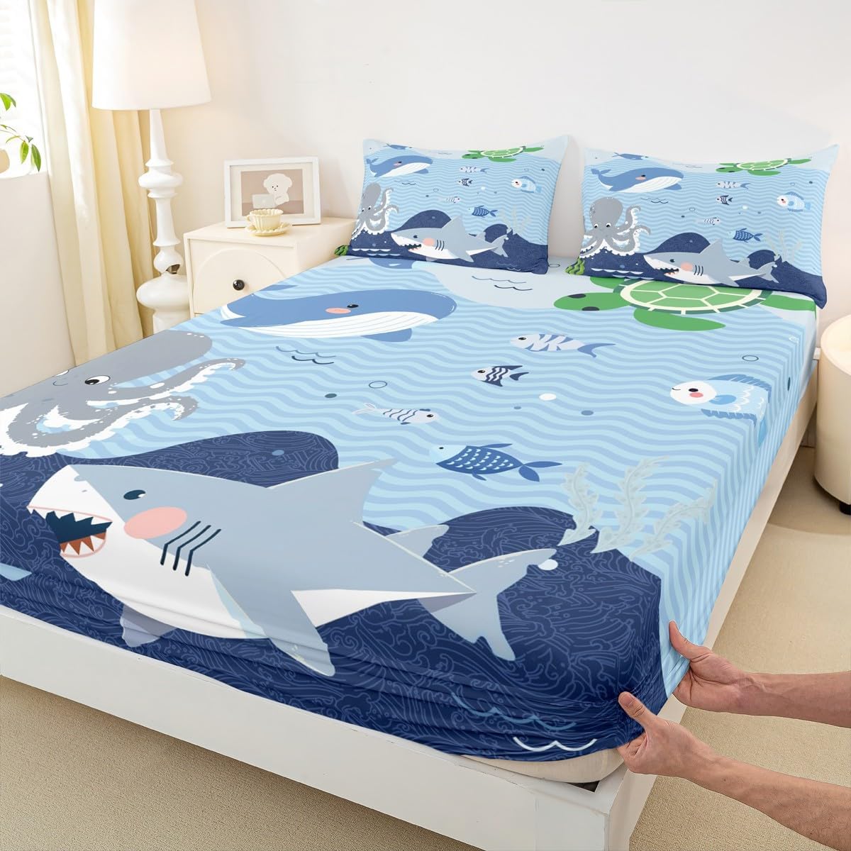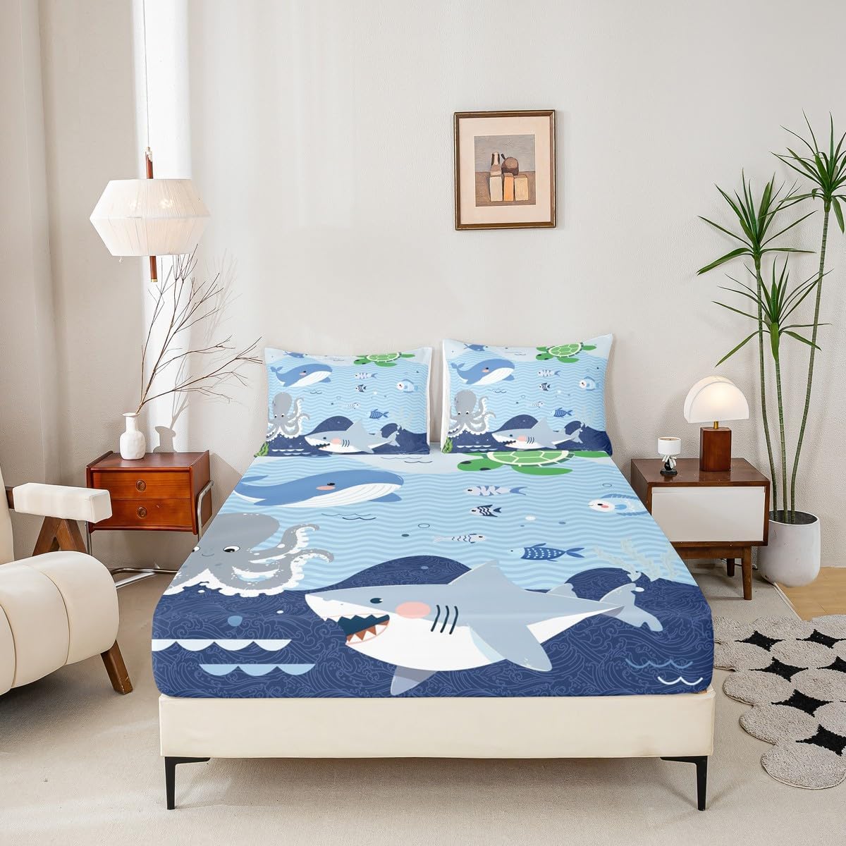 Octopus Turtle Bed Sheet Queen Set Shark and Whale Sheets Sets Adults Bedroom Decor Sea Animals Microfiber Bedding Set with Flat,Fitted Sheet,2 Pillow Cases