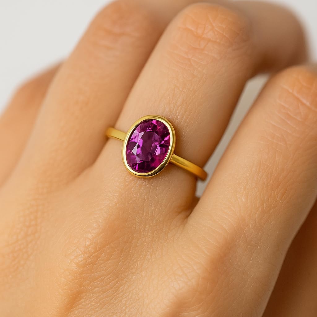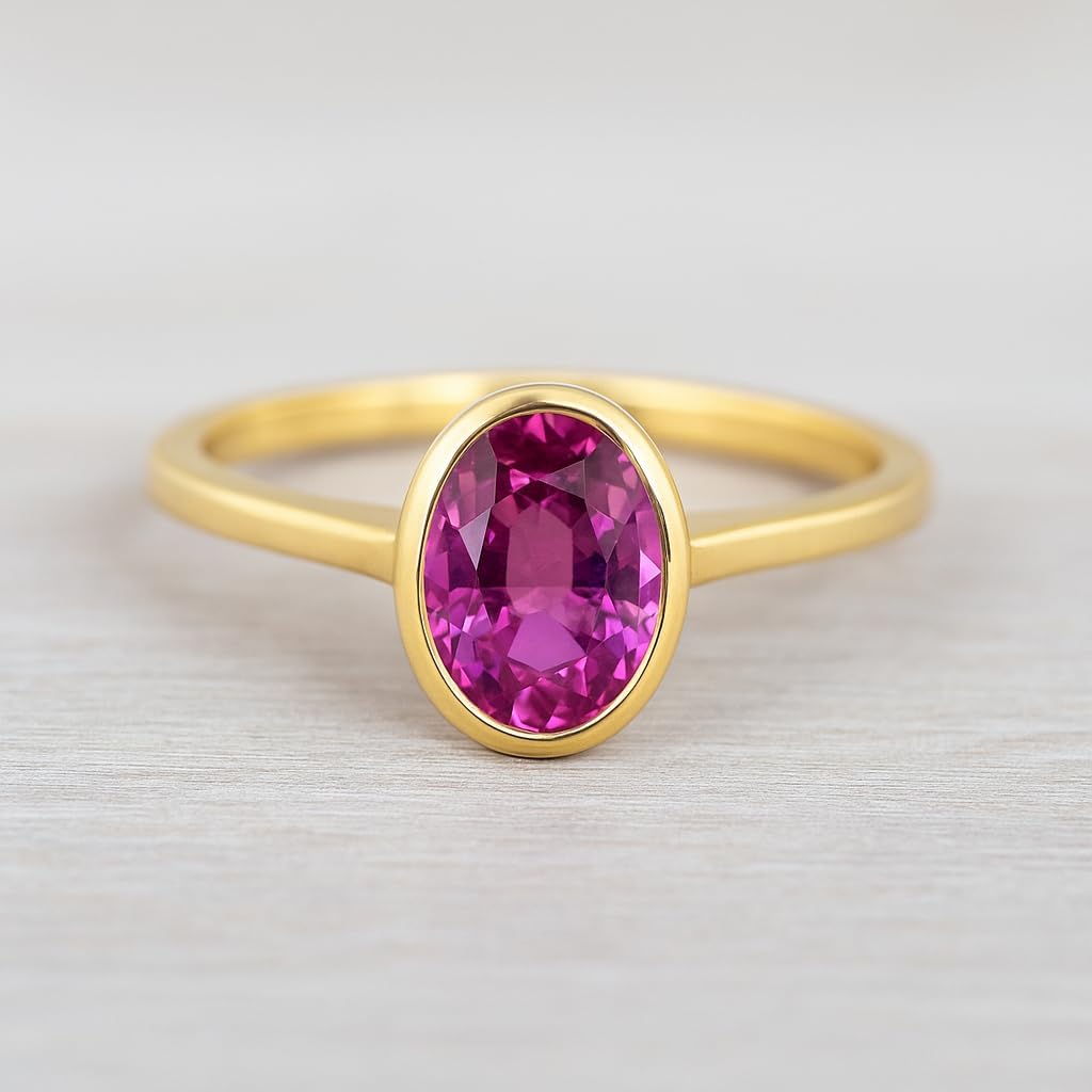 Add a touch of elegance to any moment with this stunning Oval Pink Sapphire Ring for Women. The centerpiece features a vibrant oval-cut pink gemstone that radiates brilliance and charm, making it a perfect choice for women who adore colorful and sophisticated jewelry. The stone is beautifully secured in a sleek 14K yellow gold bezel setting, offering a modern, minimalist design that is both stylish and comfortable for everyday wear. Its slim band and clean profile make it ideal for stacking or wearing as a standalone statement piece. Whether chosen as an engagement ring, promise ring, anniversary gift, or special jewelry surprise, this pink sapphire ring adds a bright and meaningful touch to any celebration. Arrives in a luxury gift box, ready to delight someone special.