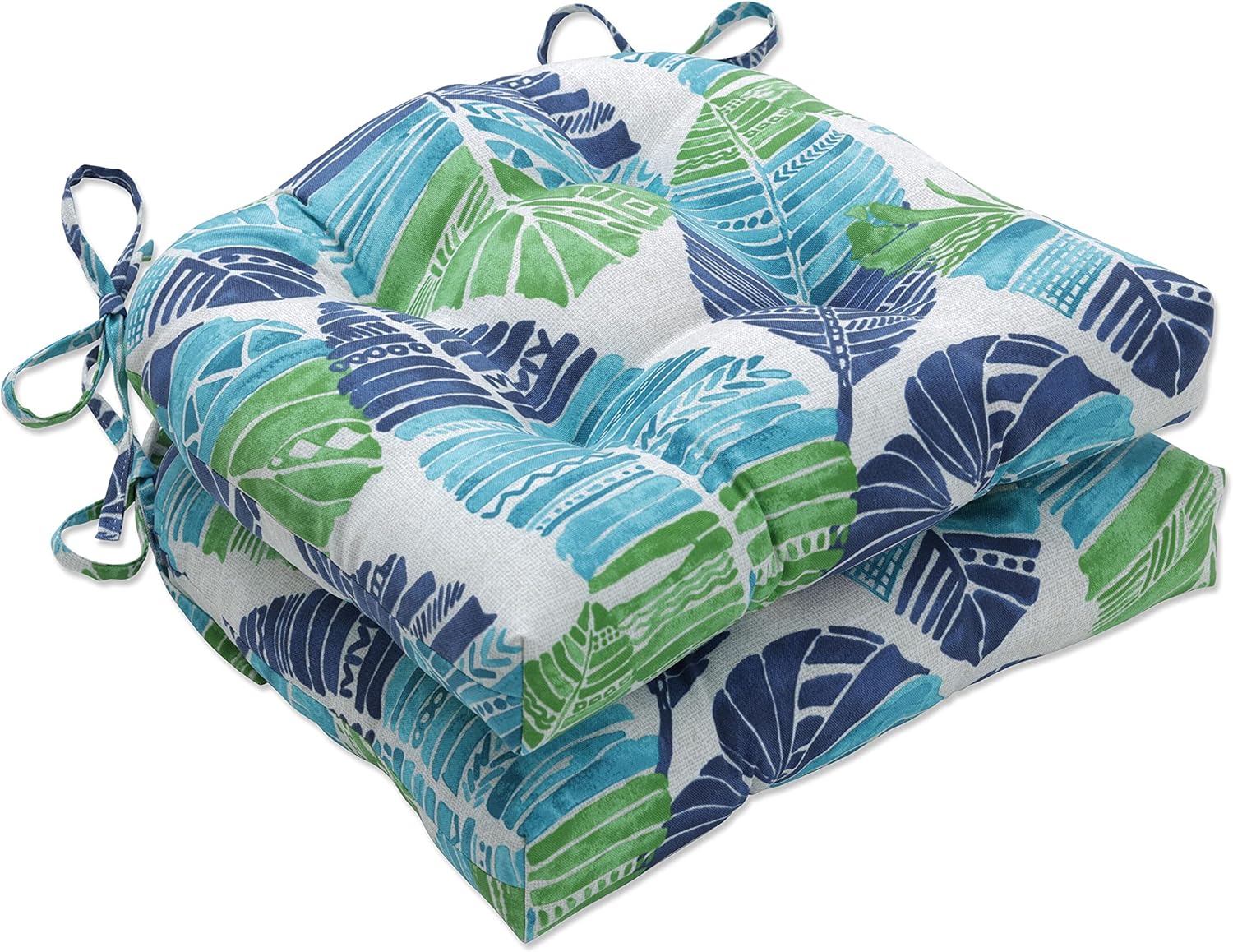 Bring the tropics home with this set of two outdoor tufted chair pads. Their bold, tropical pattern has large palm leaves in vibrant shades of green and turquoise. The palm leaves pop against the soft pastel pink ground for an updated, fresh look. Additional features of these outdoor tufted chair pads include 14" ties to secure the cushions to your furniture and recycled polyester fiber fill with sewn seam closures. Also suitable for indoor use in kitchen and dining areas.