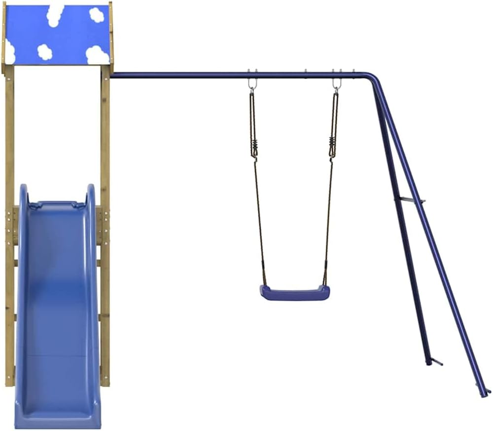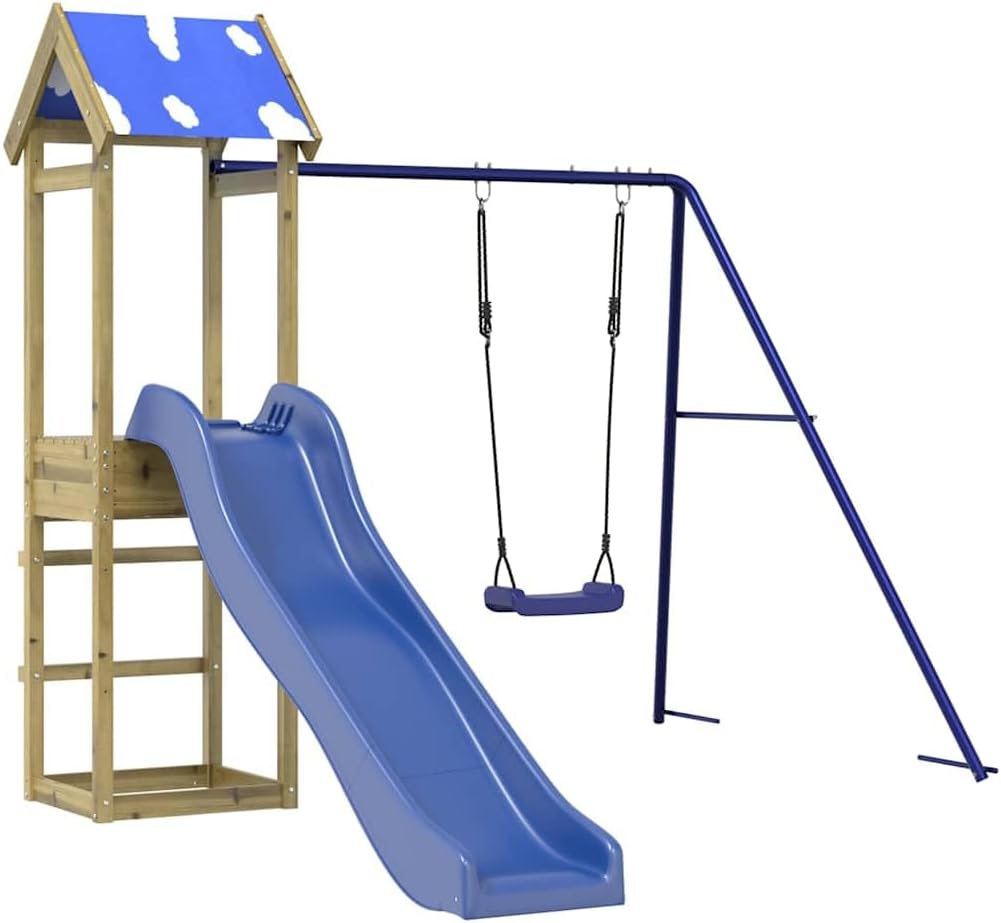 The wooden frame gives the playhouse robustness and stability. In addition, the "A" shaped frame ensures the stability of the children's swing. Multiple playing options: the play tower has a 90 cm high platform, a wave slide, a single swing and a sandpit. So your little ones can also invite their friends to play along. Sophisticated design: the cloud roof provides pleasant shade on hot summer days. Outdoor useNot suitable for children under 3 yearsRecommended user age: 3-8 years Overall dimensions: 238 x 259 x 195 cm (L x W x H). Assembly Required: Yes Play tower: Play tower material: pine wood impregnated under boiler pressure. Roof material: polyester. Dimensions: 52.5 x 46.5 x 195 cm (L x W x H). Platform height: 90 cm. Wave slide: Colour: blue. Material: PP (polypropylene). Size: 169 x 38.5 cm (L x W). Applicable installation height: 90 cm Total width of the slide: 38.5 cm. Sliding part width: 32 cm. Maximum weight per user: 45 kg. Screws for the mounting platform (M3.5 x 28mm) are included Swing: Colour: blue. Material: PP (polypropylene), metal. Overall dimensions: 188 x 160 x 162 cm (W x D x H). Swing dimensions: 32.5 x 22 x 104.5 cm (W x D x H). With: 1 x play tower. 1 x wave slide. 1 x swing.