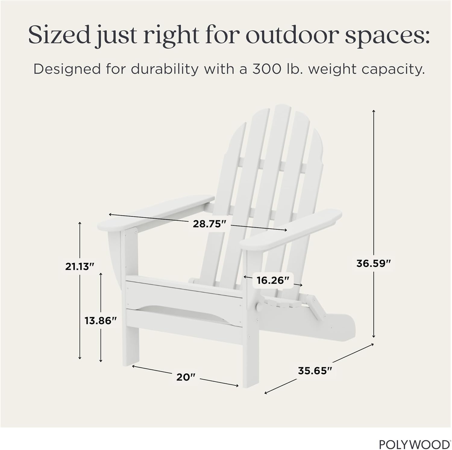 Product Description The POLYWOOD Classic Folding Adirondack (AD5030) is a comfortable, stylish deck chair made from solid, heavy-duty, marine-grade HDPE POLYWOOD to mimic the appearance of painted wood. The weather-resistant chair comes with a 20-year warranty against splintering, cracking, chipping, and peeling. Weighing 34 lbs, this chair measures 29x35.75x35.75 inches and folds down for easy transportation and storage. Made in the USA, the Classic Folding Adirondack requires no staining, painting, or waterproofing and is available in a variety of different fade-resistant colors. The contoured chair pairs well with POLYWOOD’s OT53 Ottoman, XPWS0008 seat cushion, the XPWP0106 headrest pillow, and the XPWF0010 full cushion. Manufacturer Contact Information 877-457-3284