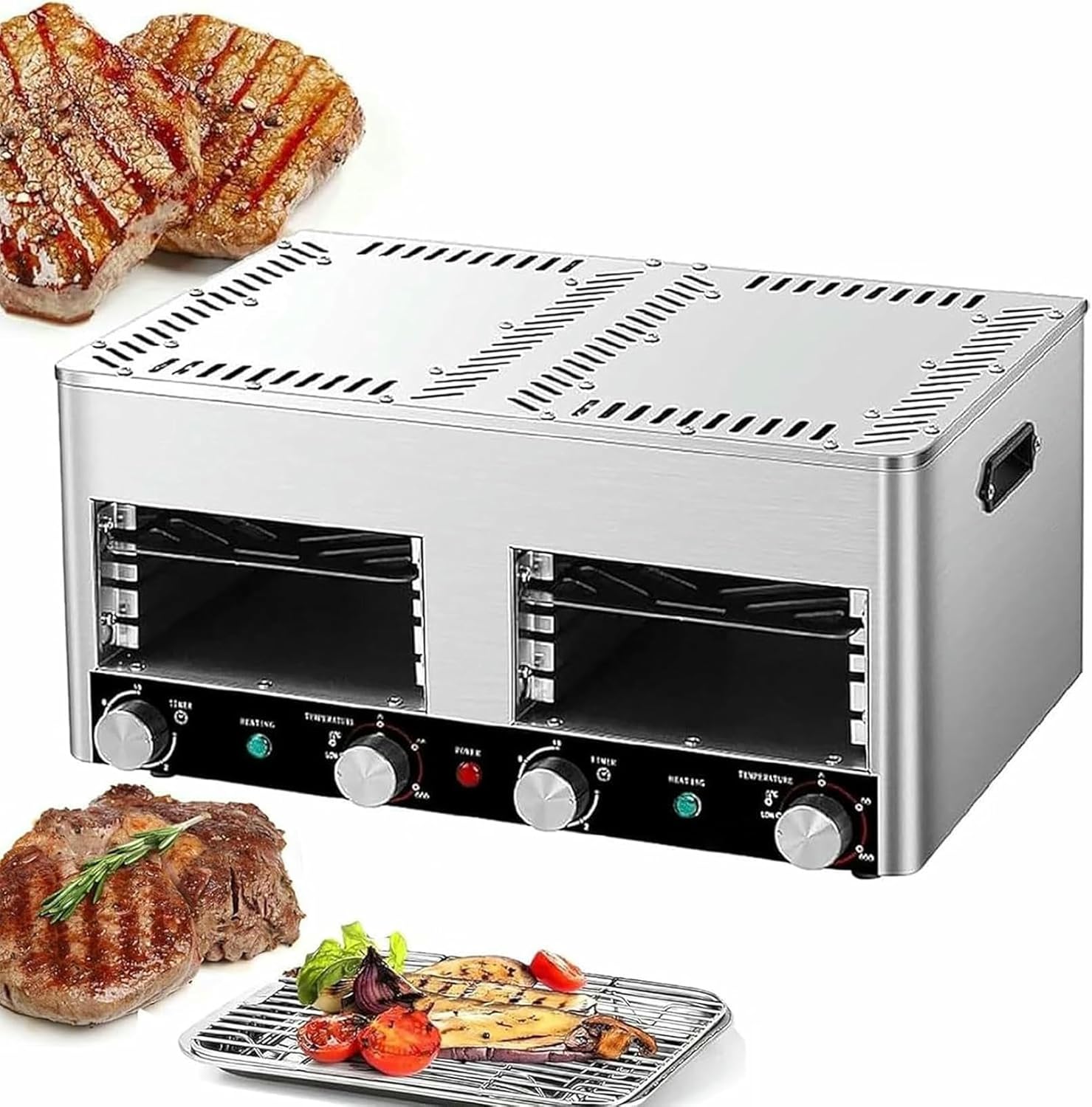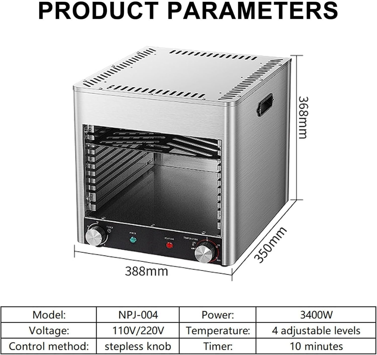 Why buy a high-temperature steak oven when you already have an oven at home?For the same thick-cut steak, the oven is set to a maximum of 300 degrees, and it takes more than ten minutes to turn it over and over. Moreover, the grilled steak has no charred layer, just like the cooking method of boiling, which wastes the delicious and expensive ingredients.【Specification】● Material: Stainless steel, rubber, PP ● Color: Silver ● Mount type: Countertop ● Cooling device: Built-in fan ● Power supply: Corded electric ● Heating method: Ceramic PTC heating ● Voltage: 220V / 50Hz ● Power: 3400W ● Number of grill slots: 10/8 ● Timing: 0-10min ● Preheating time: 5min ● Temperature range: 200-800 ℃ / 392-1472 ℉ ● Net weight: 14kg ● Product size: 36.8x35x38.8cm / 51.2x25.8x26.8cm【Packing List】- Electric steak grill x 1 - Grill x 2 - Baking sheet x 1 - Handle x 1 - User Manual x 1【Notes】1. Please read the operating manual before use and pay special attention to the enclosed safety instructions.2. Please wait for the grill to cool down before taking it out.3.The size of the product is manually measured, there may be an error of about 1-2cm, please understand4. If you have any questions, you can send us an email and we will reply within 24 hours