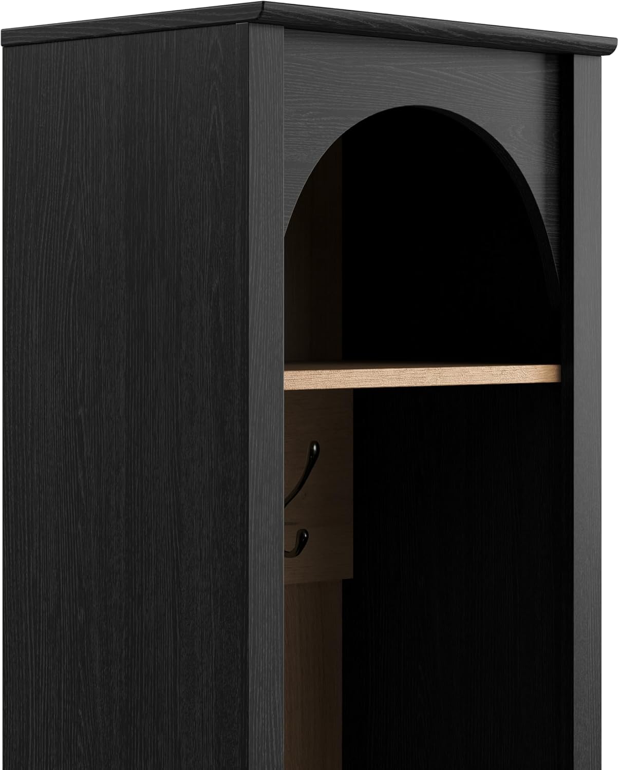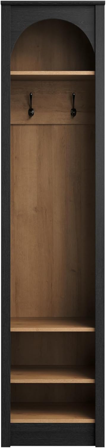 The Ark Black Oak 76" Arched Entryway Coat Rack, Hall Tree is a sophisticated and functional addition to any home. Designed as a coat rack for entryway, this stylish piece keeps your space organized while adding a modern touch to your decor. Whether placed in a laundry room, bedroom, or front entrance, this coat rack for front door entrance provides ample storage for jackets, shoes, and accessories. The distinctive arched accent adds a sophisticated flair to the design, elevating its aesthetic appeal. Its graceful curve blends seamlessly into both modern and traditional interiors. The four sturdy metal coat hooks offer a convenient place to hang coats, hats, scarves, and bags, ensuring quick access as you head out the door. Whether you’re styling it as an arched entryway for modern coat rack or as a dual-toned storage solution that highlights the contrast of natural oak inside and black finish outside, it’s certain to draw attention.Built for functionality, this features two adjustable shelves and one fixed shelf, allowing for customizable storage. The sturdy construction ensures durability, providing long-lasting use as a reliable storage solution for your entryway or hallway. The four metal coat hooks further enhance its practicality, dedicated hanging space for outerwear and accessories. With its design and materials, the Ark Black Oak 76" Entryway Coat Rack is the perfect blend of practicality and style. The modular design allows you to personalize the layout, making it more than just a coat rack—it's a entryway furniture piece that enhances both organization and aesthetics. Whether you're looking for a hall tree to streamline your entryway or a stylish coat hanger to keep your space, this coat rack freestanding unit delivers the perfect balance of form and function.