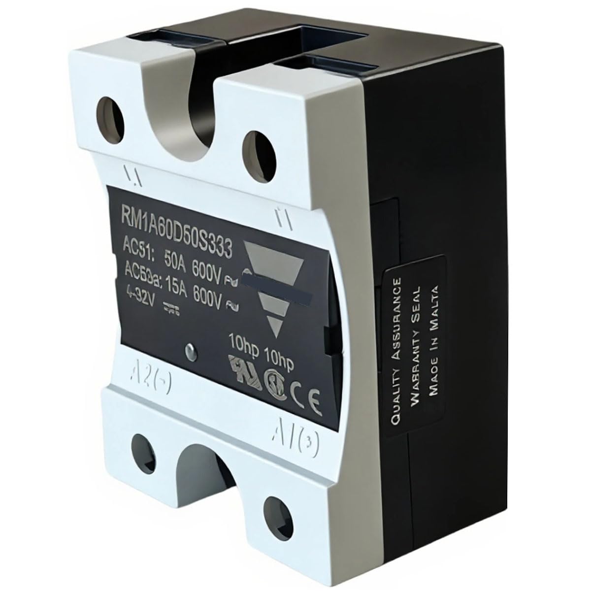 Solid State Relay (SSR) Replacement - Part #RM1A60D50S333This listing is for an AC solid state relay used to switch AC loads with a low-voltage DC control signal. Please confirm the full part number and electrical ratings match your original unit before purchase.Key SpecificationsType: AC Solid State Relay (zero-cross), 1-pole SPST-NO outputControl input: 4-32VDCLoad side: 42-660VAC, up to 50A (AC-51) / 15A (AC-53a)Terminals: screw clamp terminals (4 terminals: 2 control + 2 load)Protection/indication: built-in varistor surge protection, LED input statusWhat It DoesSwitches AC loads such as heaters, blowers/fans, motors, and lighting from a DC control signalZero-cross switching can help reduce electrical noise and stress during turn-on for many AC loadsSolid-state design for silent, fast switching (no mechanical contacts)Common Symptoms When a Relay Is FailingLoad does not turn ON/OFF as commandedIntermittent operation, flicker, or unstable load controlOverheating around the relay/heatsink area or discolored terminalsInstallation NotesDisconnect power before service and verify wiring/terminal markingsUse a suitable heatsink/metal panel and good thermal contact (thermal pad/compound recommended); ensure airflowGround the heatsink as required by the product’s safety guidanceAfter installation, confirm line voltage and load current are within spec; retighten terminals after a short runFitment reminder: Confirm fitment by OE/part number RM1A60D50S333 and your wiring diagram/manual. Do not order based on appearance alone.