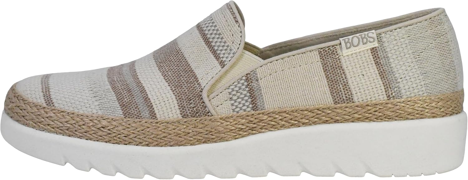 Elevate your casual style with the BOBS Flexpadrille HI Shoes - Serene Heights Memory Foam Casual Espadrille Slip On Vegan. These memory foam shoes for women feature a striped woven hemp upper with twin gore panels and jute midsole trim for a classic espadrille look. The casual design combines comfort and style with a shock-absorbing lightweight midsole and flexible traction outsole. Perfect for those seeking memory foam womens shoes that deliver both style and comfort.