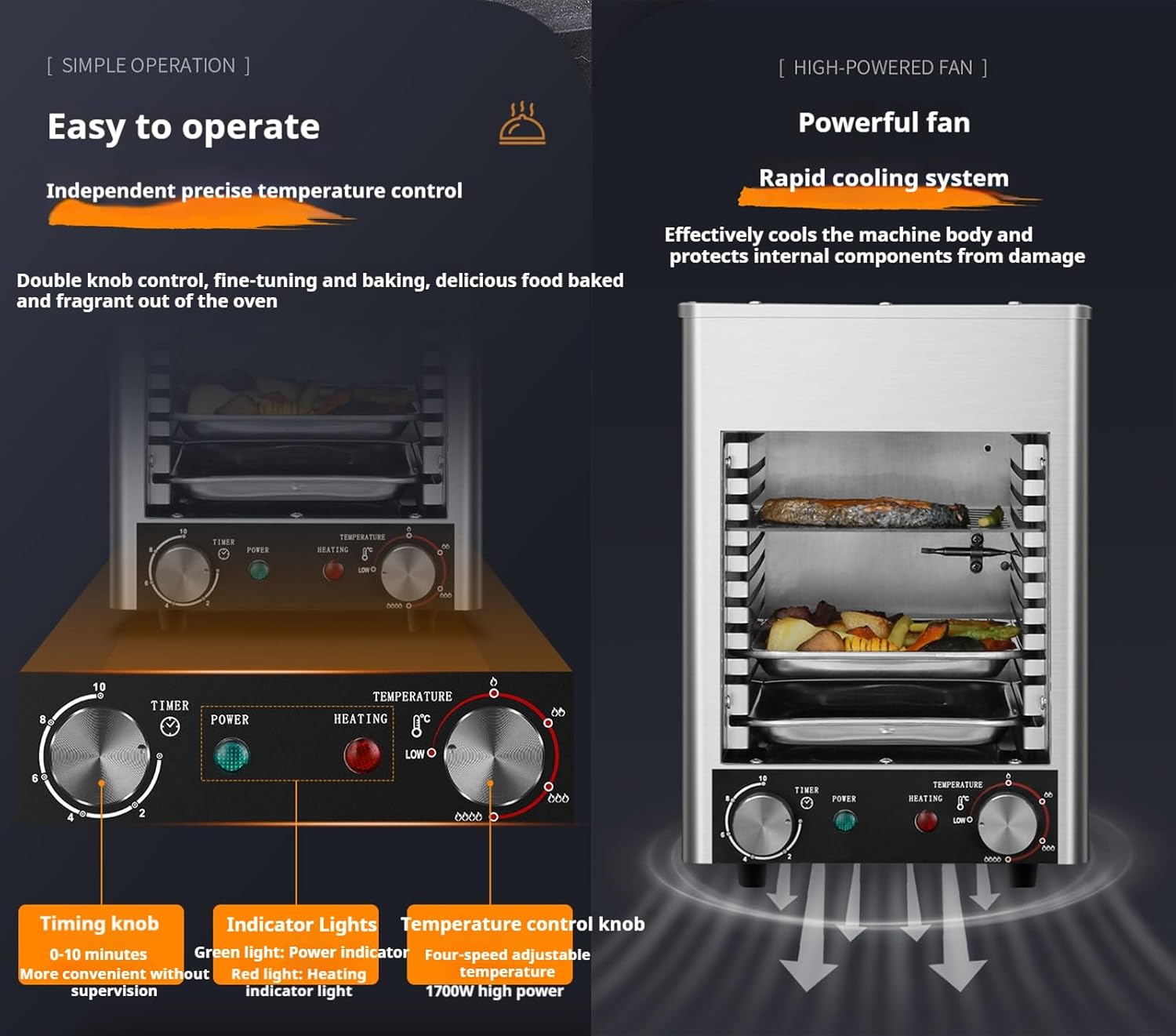 ?【Product Description】This electric steak grill is designed for fast, even searing and flexible cooking, so you can enjoy restaurant-quality steaks at home. It is equipped with a powerful 1700W/3400W ceramic PTC heating system, which can reach a temperature of 800°C (1472°F) in just minutes, locking in flavor and moisture for perfectly crispy steaks. The stepless knob allows you to control both temperature (200-800°C) and time (0-10 minutes), and is equipped with a built-in indicator light for easy and intuitive operation.This grill is equipped with 4 or 8 adjustable grill slots, and you can adjust the cooking height according to different types of food - from thick rib-eye steaks and T-bone steaks to chicken, seafood, and even desserts. The electric design ensures safer and cleaner indoor use, without the need for gas. Best of all, the non-stick grill parts are removable and washable, making cleaning very simple.⚙️【Product Specifications】Power options: 1700W / 3400WHeating method: Ceramic PTCTemperature range: 200–800°C (392–1472°F)Timing range: 0–10 minutesMaterial: Stainless steel + PPFrame design: 4 or 8 layers adjustableVoltage: 110-120V