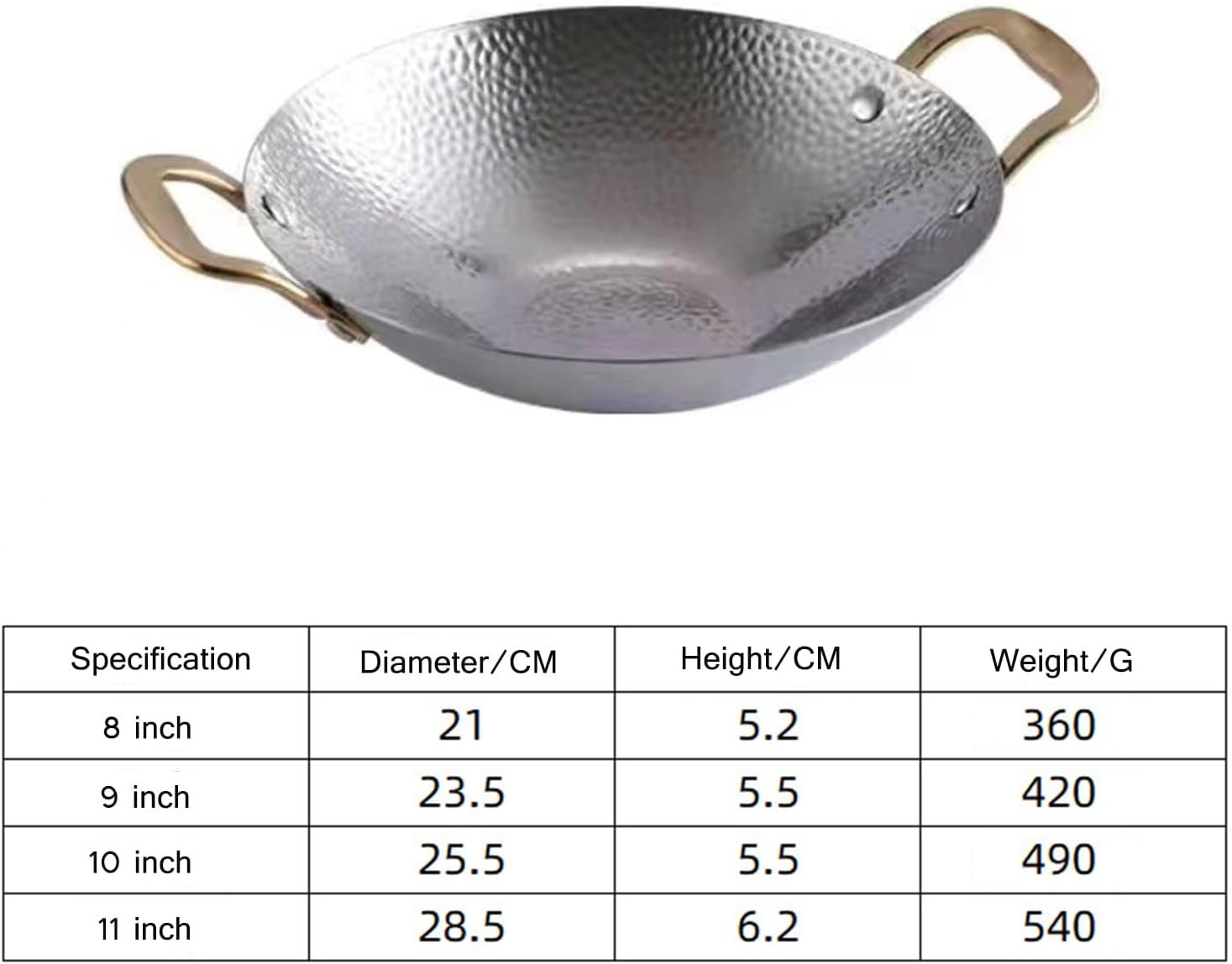 Stainless Steel Spain Paella Pan Uncoated Non-Stick Skillet 8"/9"/10"/11" Fry Pan Small Hot Pot Noodles Pans with Double Handles Stockpot for Home Restaurants, and More Feature: - Hammered Seafood Rice Plate - Rivet-reinforced double handles are anti-scald and easy to transport - Uncoated physical non-stick - Suitable for gas, oven, induction and gas burners - Not for families, but also for hotels, restaurants and other places - It can also be used for shabu-shabu pot /fruit plate/stir-fry platter/pork ribs/seafood in dry pot/deep fried snacks. Specifications: Name: Paella Pan Material: StainlessSteel Color: Silver/Gold/Silver with gold handle Size: 8inch/9inch/10inch/11inch Feature: - Hammered Seafood Rice Plate - Rivet-reinforced double handles are anti-scald and easy to transport - Uncoated physical non-stick - Suitable for gas, oven, induction and gas burners - Not for families, but also for hotels, restaurants and other places Package List: 1 x Spanish Paella Pan