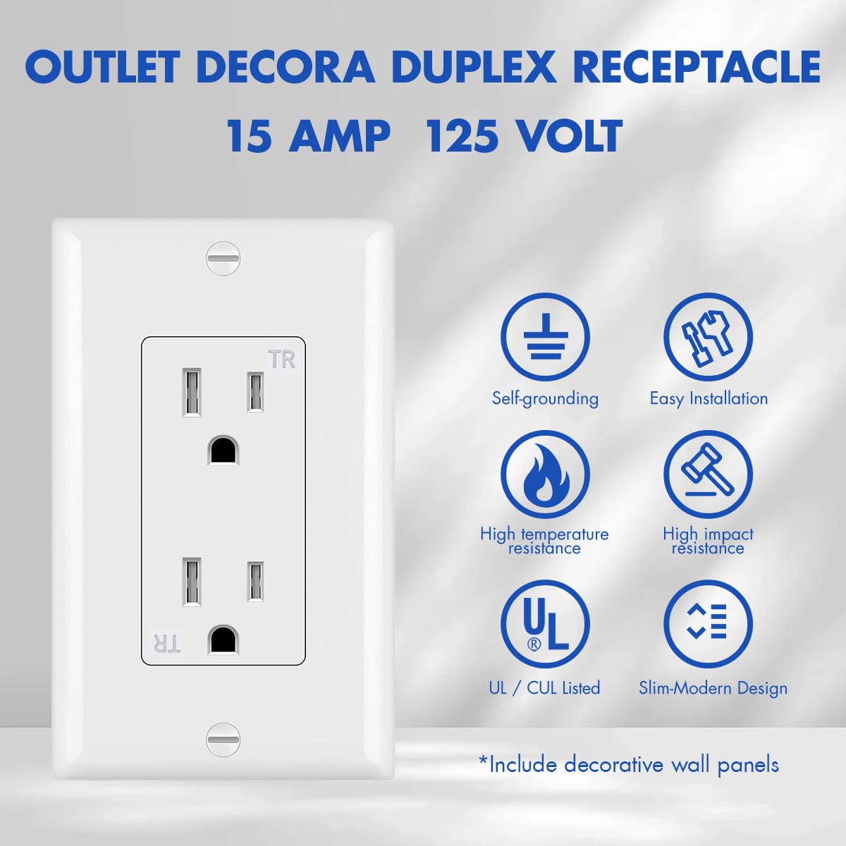 EZsport Electrical Wall Outlets is a high-quality product for residential and commercial applications. Tamper Resistant Duplex Receptacle Standard Wall Outlet Decorative Electrical Outle,residential grade,3-Wire, 2-Pole, 125V,Wall Plates Included, White. These outlets are designed to prevent foreign objects, such as forks and knives, from being able to fit into the outlet. this residential-grade decorator outlet is perfect for anywhere. This decorator electrical outlet is self-grounding for easy, straightforward installation.