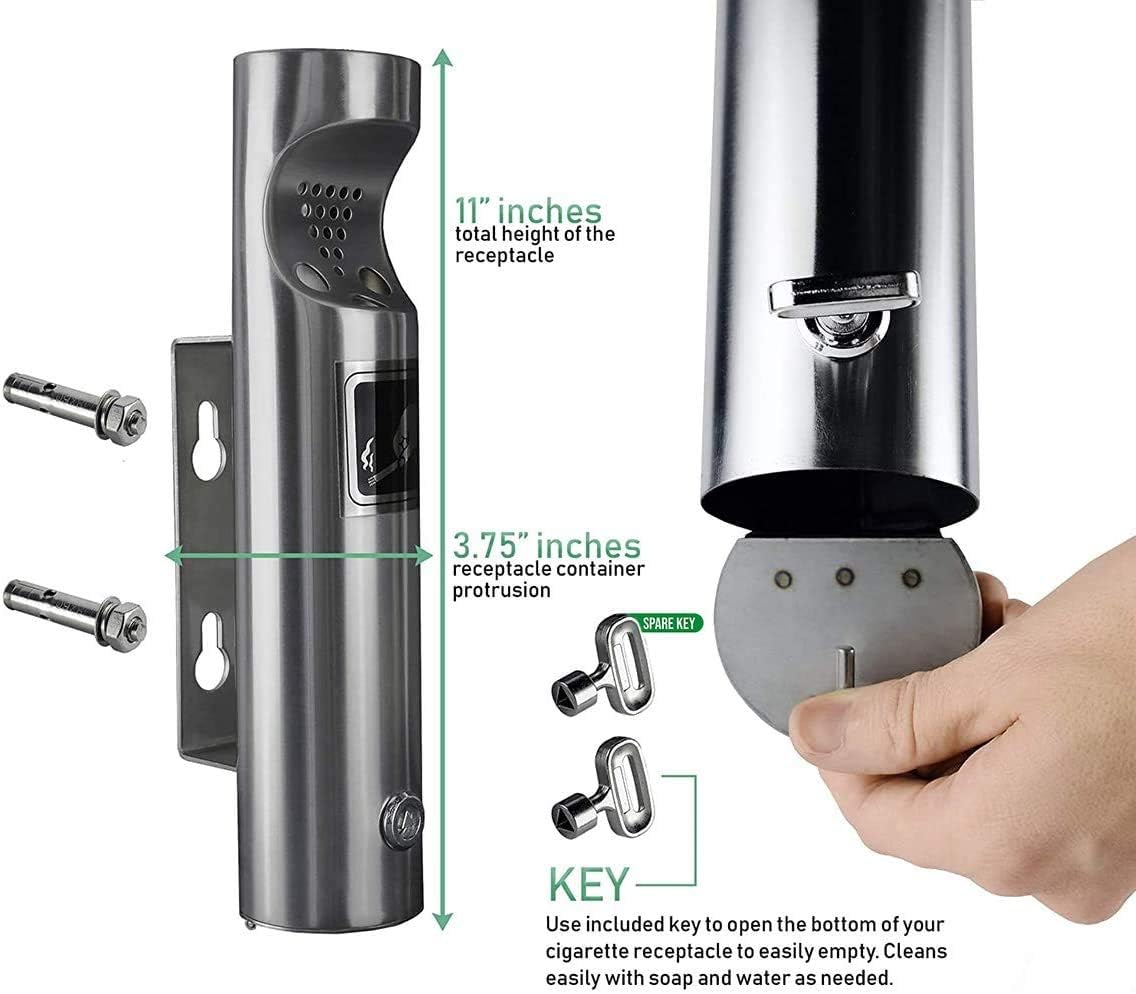 Elevate the cleanliness and appearance of your outdoor smoking areas with the Striive Stainless Steel Wall-Mounted Cigarette Butt Receptacle Kit. Designed for both commercial and residential use, this sleek stainless steel ashtray combines durability with a professional aesthetic, making it perfect for restaurants, bars, office buildings, and other high-traffic spaces. Key Features: Durable Stainless Steel Construction: Built to endure outdoor elements, this receptacle resists rust and corrosion for long-lasting use in any environment. Double-Sided Weatherproof Smoking Sign: Includes a 4" x 8" durable, double-sided sign to designate smoking zones and encourage responsible cigarette disposal. Effortless Installation: Comes with (2) mounting bolts for secure wall installation; screws for attaching the smoking sign are not included. Convenient Cleaning Access: Features a bottom-opening mechanism with a key for fast and hassle-free cleaning. Versatile Applications: Perfect for outdoor smoking areas in restaurants, bars, public spaces, office entrances, and home patios. Choose the Striive Stainless Steel Receptacle Kit to keep your outdoor spaces organized, clean, and inviting while offering a professional solution for cigarette waste management.