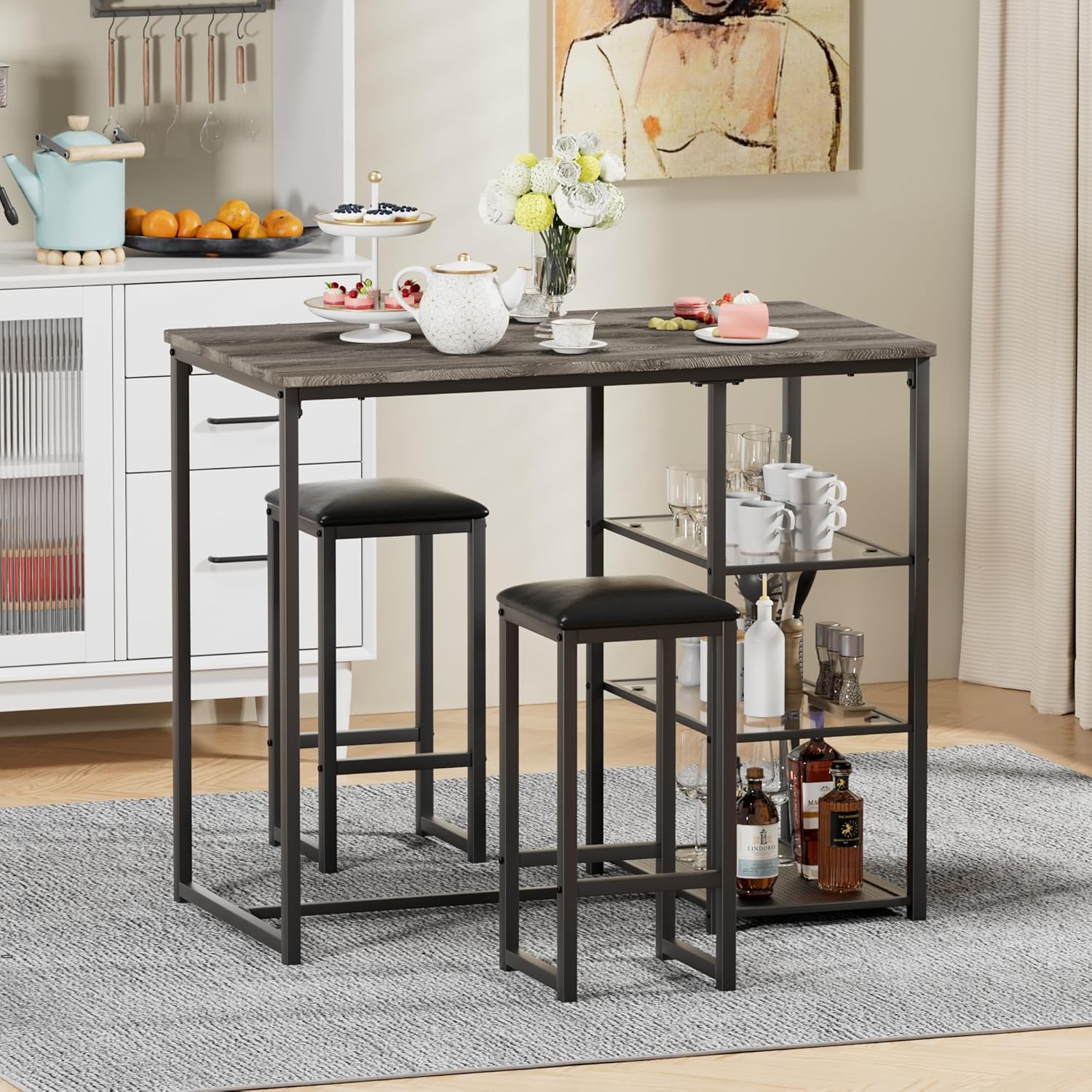 Why choose the VECELO Dining Room set?3- piece counter height dining table set :This bar table and chairs set includes 1 bar table (42.1"L x 23.6"W x 35.8"H) and 2 bar chairs (12" Lx 12"W x 24"H). On one side of the kitchen table, we've added 3-layer storage racks to store your frequently used tableware or condiments and snacks. Space-saving Design: The dining table set features three shelves that are perfectly designed for storing drinks, flatware, bottles, glasses, or anything else you need to keep on hand. Stools can be stored under the table when not in use.Wide range of uses: Suitable for your kitchen, living room, dining room, patio, bar, or office. This bar table set can be transformed into a bar dining table, breakfast bar, coffee bar, homework table, dining room counter, etc.Friendly Customer Service: If you have any further questions about this product, please feel free to send us an email.Everything You Wanted to Know!Color: GrayMaterial: MDF+Metal+Tempered GlassTable Size: 42.1"L x 23.6"W x 35.8"HStool Size:12" Lx 12"W x 24"HSeating Capacity: 2Package Includes:1 x Dining Table2 x Stools1 x Instruction1 x Assembly KitTips:Please read the instructions carefully before assembly.Please align all bolts with screw holes and then tighten them. DO NOT fasten one side first then the other, which would cause the stool to become unstable.