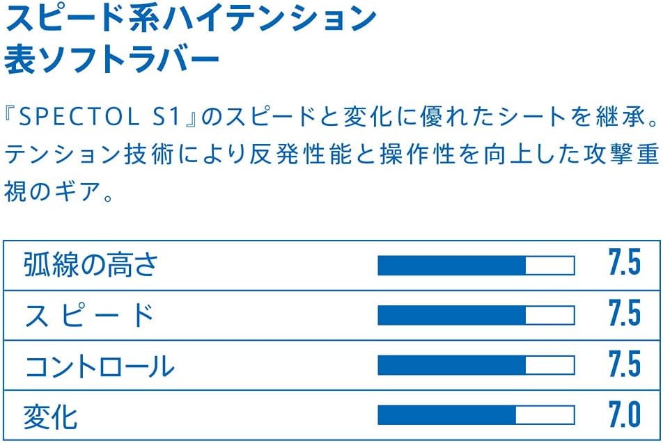 Speed type high tension surface soft rubber. Inherits the S1 seat with excellent speed and change. Attack-focused gear with tension technology for improved rebound performance and maneuverability. ■ Alpine Color (Manufacturer Color): Black (0020: Black) Red (0040: Red) ■ Type: tension type ■ Hardness: 37.5±3 ■Country of Manufacture: Japan ■ 2022 Model