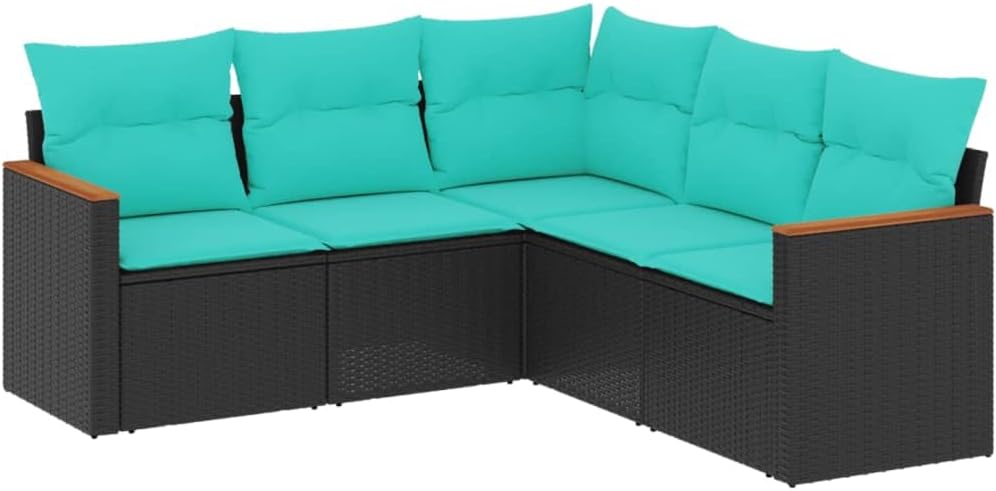 This 5-Piece Modular Patio Sofa Set is a great outdoor seating option, designed for style and comfort in any backyard or balcony. With its sleek black poly rattan and vibrant blue cushions, it elevates the look of outdoor spaces while providing a cozy spot for hangouts or relaxation.Modular Design: Allows for flexible configurations, great for any space adaptation. Tailor the arrangement to suit your outdoor setting and entertaining needs.Weather Materials: Made from UV- poly rattan, this patio set stands strong against the elements, ensuring durability and beauty through changing seasons.Comfortable and Plush Cushions: Featuring thick cushions, this set promotes relaxation during sunny days, making it a go-to choice for hanging out with friends and family.Easy to Clean: All cushion covers are removable and washable, so maintenance is a breeze and your patio set stays bright and fresh.Sleek and Modern Style: The contemporary design with smooth lines boosts the elegance of your outdoor space, making it a showstopper for get-togethers and leisure.Color: BlackShape: RectangularMaterial: Synthetic Poly RattanIndoor/Outdoor: Outdoor OnlyCover Included: NoRoom: Garden and TerraceHeadboard Included: NoCapacity: 5-Piece set can accommodate multiple seating arrangementsMaximum Weit: 535.5 lbDimensions: 9.6 x 9.6 x 10.7 in (W x L x H)Seat Depth: 21.7 inSwings: NoLadder: NoBrand: vidaXLDelivery Contains: 1 x Corner seat, 2 x Center seat, 2 x Arm sofa, 6 x Back cushion, 5 x Seat cushionAssembly Required: YesSKU: 3225959EAN: 8721012999251