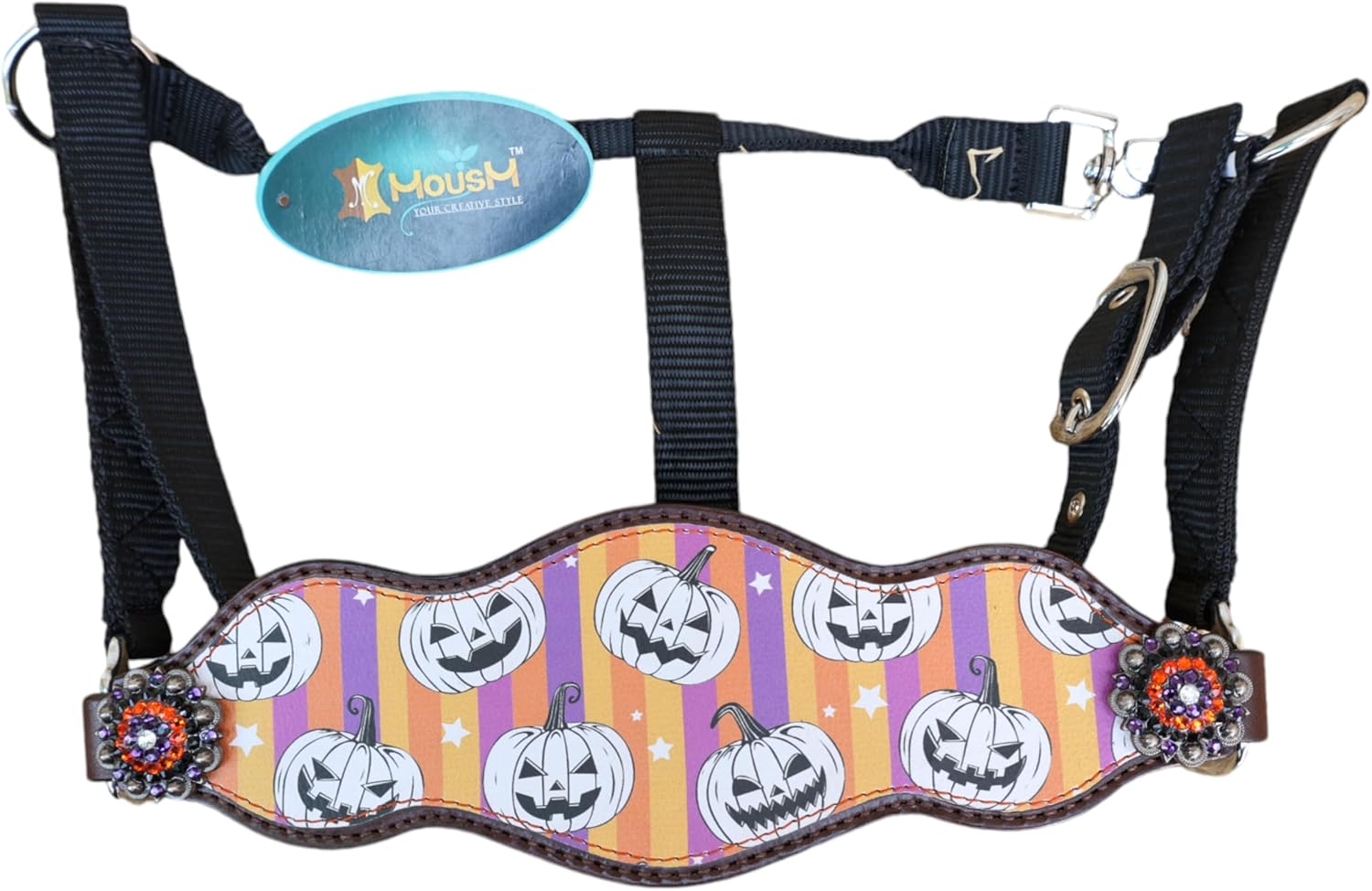 Add a spooky twist to your horse’s gear with this Western Leather Headstall and Breast Collar Tack Set! This set features a unique **laughing Halloween pumpkin design** with eye-catching **purple and orange stripe accents** that give it a festive and bold look. **Rhinestone conchos** enhance the design with a touch of sparkle, making it perfect for Halloween parades, events, or just showing off your horse’s personality. Made from durable, high-quality leather, this tack set offers both comfort and longevity, ensuring your horse looks great while staying secure. Ideal for Western riders who want to stand out in style this Halloween!