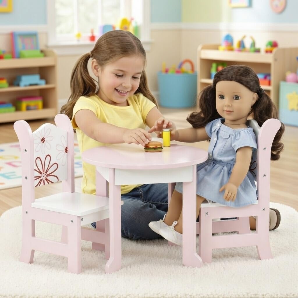 | Included Components | 1 Wooden Dining Table, 2 Wooden Sitting Chairs, Assembly Hardware, Step-by-Step Assembly Instructions, (Dolls, doll clothes, food, dishes, and accessories shown are for display only and are not included) |